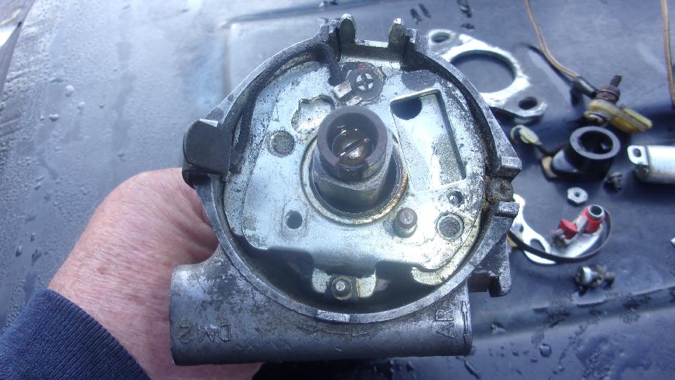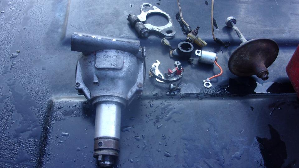 Okay, reassemble it as original, and we will play musical chairs with the HT wires to avoid reorienting the drive gear (for now). We can get away with this when we are using a top entry distributor cap. Then pull the known good vacuum unit from the old dizzy and install it in the new dizzy, install a new set of points with the (probably good) used condenser, and it was soon installed in the car and running. Note to self: turn the gear around and fix the HT wires later.
