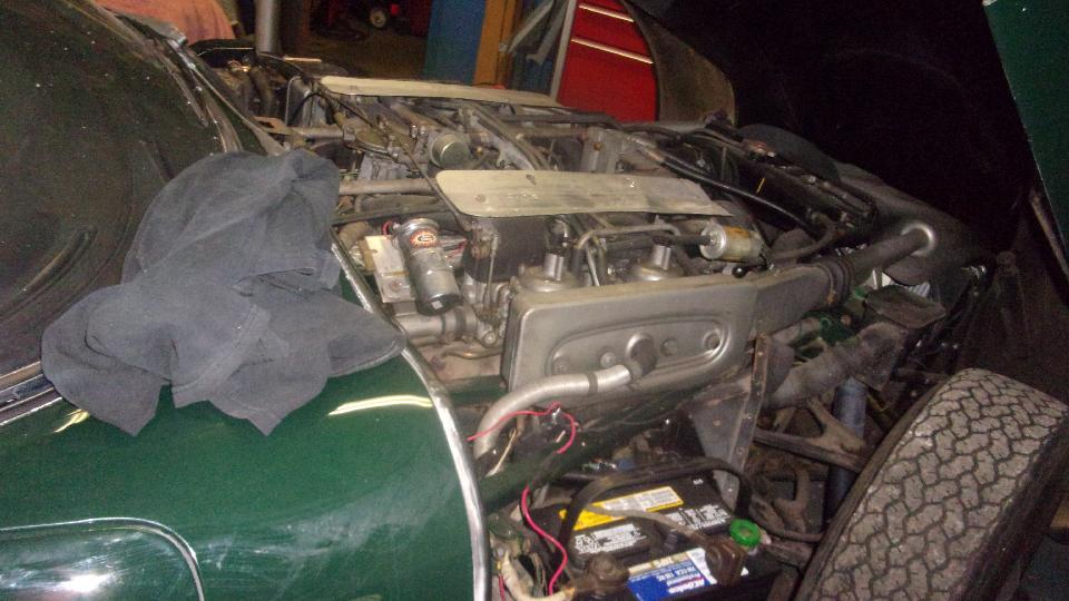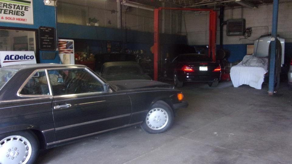 There were three Mercedes in the shop today, but he also has his own Jaguar E-Type V12. He likes working on it mostly because it's a challenge. He doesn't have enough time to drive it much, but it has done a good job of taking over fun time from his Corvette (which he used to drive a lot). We caught him in a good mood. Last night his only daughter presented him with his only granddaughter (we hope only the first).