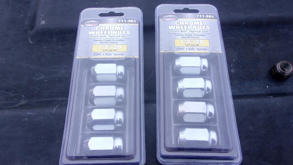 First stop today was a NAPA Auto Parts to pick up grease cartridges and some new lug nuts for the trailer wheels. Story here is that many years ago I bought alloy wheels for the car, then having to install longer wheel studs to accommodate the thicker wheels. Wanting to protect the longer threads on the studs, I thought it was a good idea to buy closed chrome "acorn" lug nuts. Those came with 13/16-inch hex size rather than original 3/4-inch, so I also bought a larger lug wrench. The trailer had standard lug nuts with 3/4-inch hex, and since I have to swap the trailer tires regularly I thought it would be nice to have matching lug nuts so I could use the same lug wrench for car and trailer. Car has 7/16 studs, now with 13/16 nuts. Trailer had 3/4" nuts, so I thought it would be same 7/16 studs as on the car.