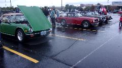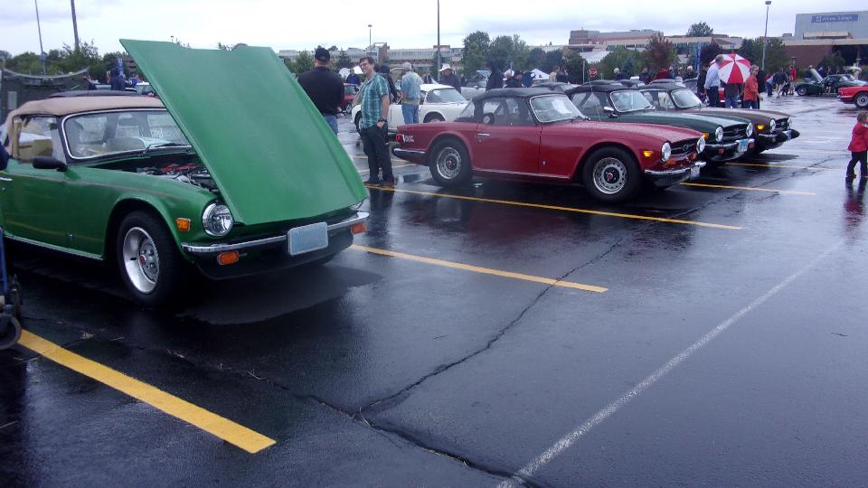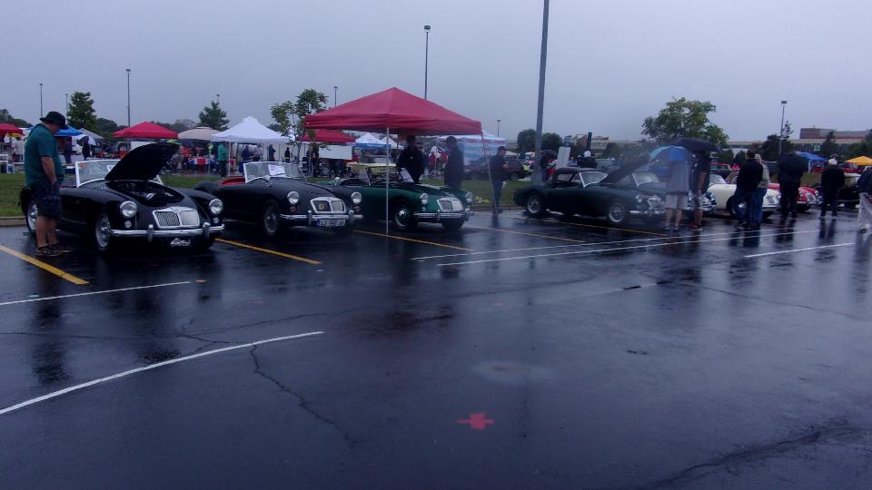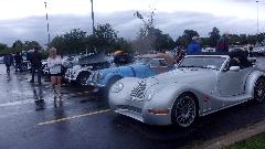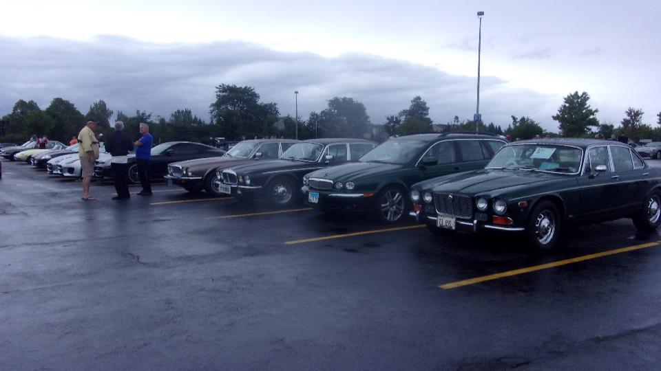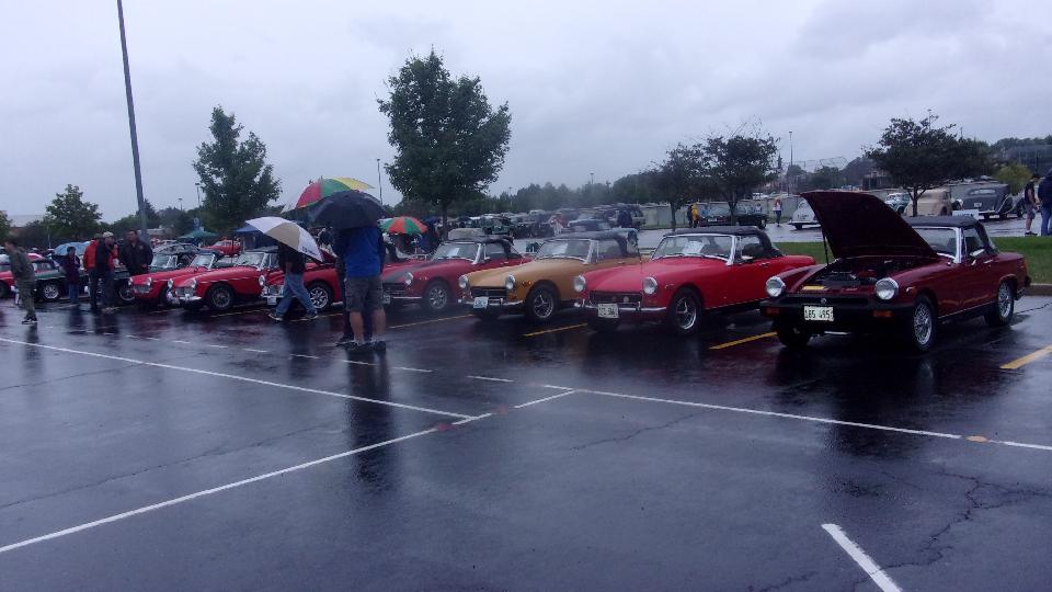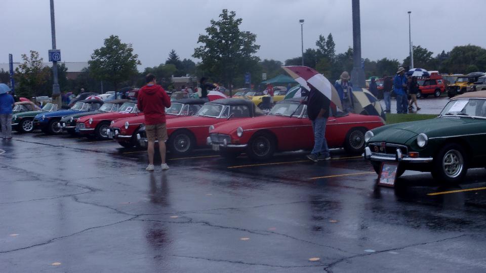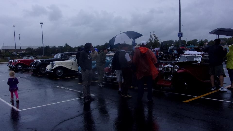 Dropped navigator off in Wheaton, IL to have a day off with his friends. Then off to British Car Festival, hosted by British Car Union at Harper College in Palatine, IL. As we have been on the road for five years, last time we attended this event was 2013, so it seemed reasonable to backtrack across a couple of states to meet up with some old friends. There are nearly 100 photos here, so before I get too carried away there is a separate page for the bulk of the photos, see following page. The rain was not nearly as bad as it looks, maybe a few umbrellas, but not many people under the awnings. I was walking around from 9 to 3 and barely got damp, no soaking at all.