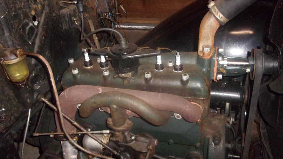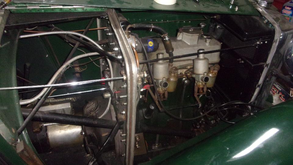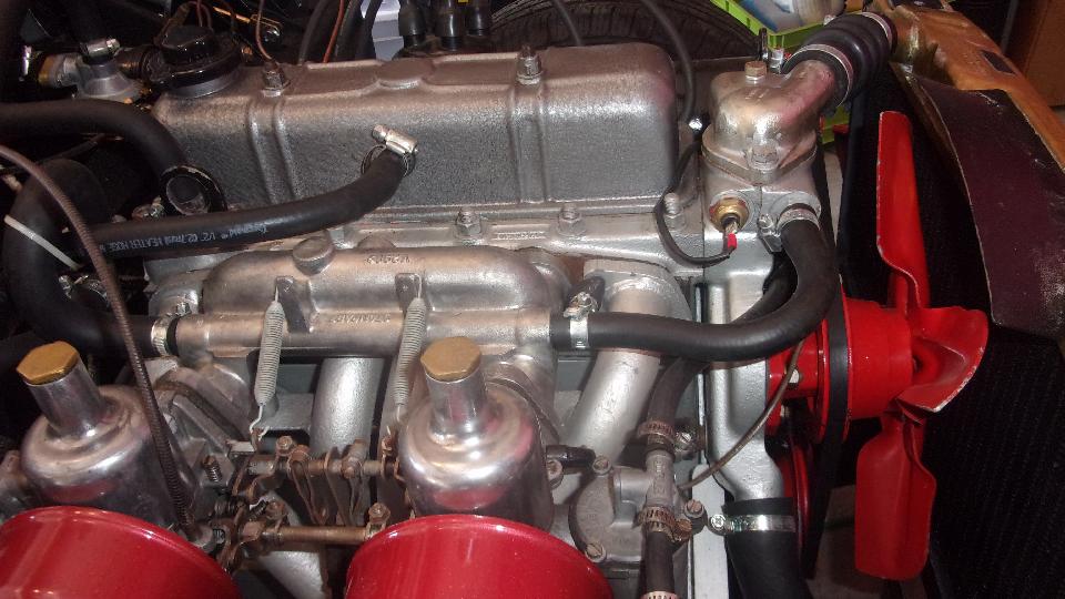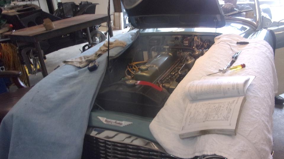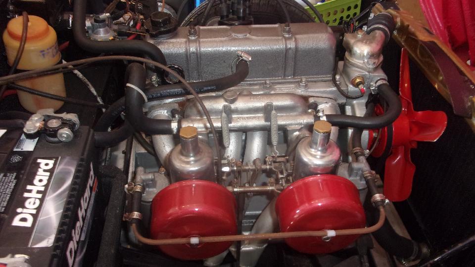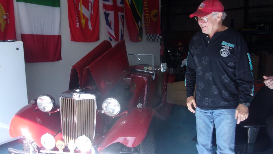 Notice the TR3 in the far left corner. This one had a case of no start, which turned out to be a case of no choke. Pulling choke cable full out did not produce any choke motion at the carburetors. This was soon corrected by adjusting length of the choke cable at the carburetor end, after which full choke and crank fired it right up. Then running rough, one carb was very lean (hardly firing), while the other carb was a little rich (wanting to gallop), resulting in a galloping misfire condition (very bad running). A few minutes of fiddling set that right with generally standard tune-up, but still sluggish throttle response. So around the other side I gave the distributor a slight twist to advance ignition timing some, after which it had wonderful throttle response wanting to head out on the road. I had a fond smile for the Mallory Dual Points distributor, as until recently I had run one of those in my MGA for 30 years.