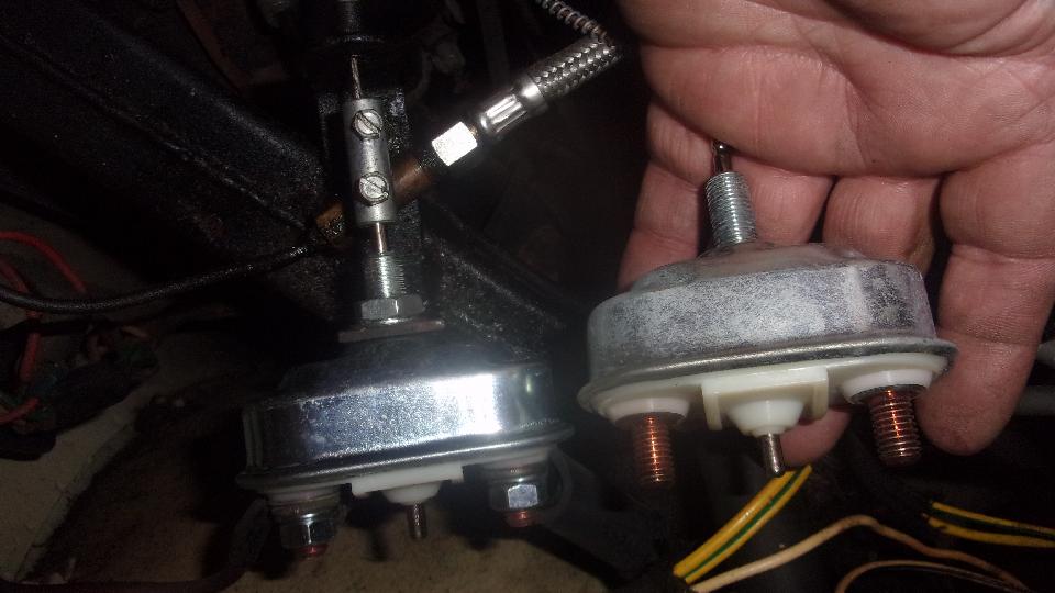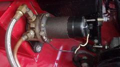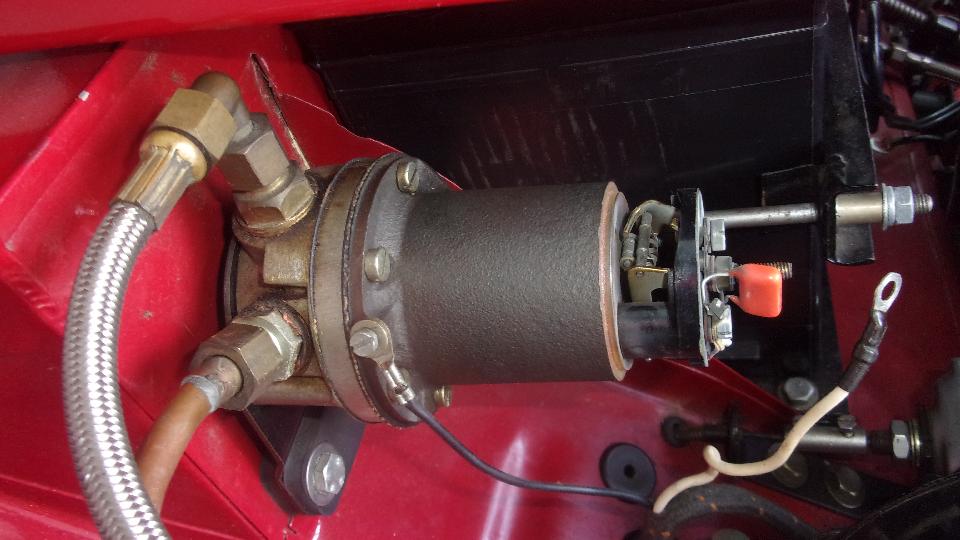 Panama City. The car we came to see today was his MG TD, not running. Asking a few questions, it sounded like lack of fuel. Switch on revealed no ticking of the fuel pump. Test light shows power and ground, no ticky. Disconnect power wire from pump, remove end cover, touch power wire to input stud, get one tick. Touch, touch, touch makes tick, tick, tick, but it would not tick more than once for each power on cycle. So the SU fuel pump has suffered old age failure. I figure the pump diaphragm has become stiff, not giving enough travel to allow the contact points to click over center, so the pump needs to be replaced or rebuilt (owner's choice).