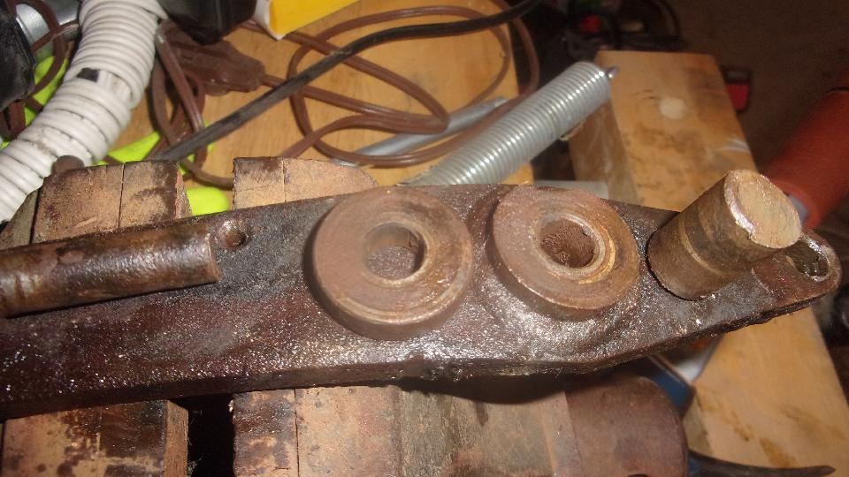 Bronze bushings were firmly glued onto the pedal steel sleeves, and the steel sleeves rusted to the pivot bolt, so no way to drive the bolt out of the assembly. Solution was to bend the brackets slightly away, then Sawzall through the bolt twice and also one of the steel sleeves in the process. That got the pedals out. I had new steel sleeves and bushings in the magic trailer, but the old bushings were still good. Had to run to town for a new 3/8x3 hex head bolt, and grab some pizza to take back for dinner. By that time it was past dark so we called it a day and will take after it again tomorrow.
