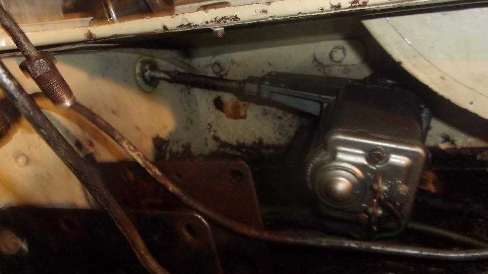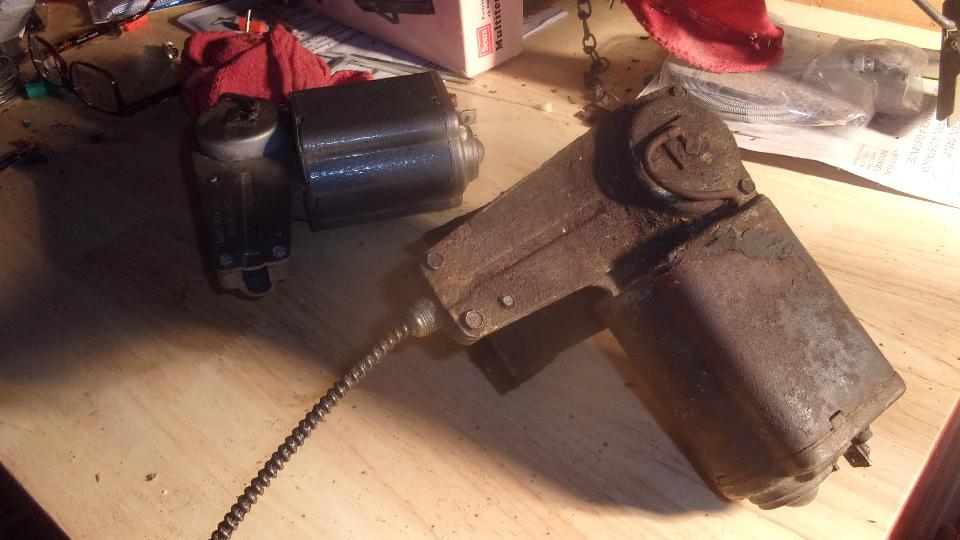 Up late, slept in, went into town for breakfast 10-am. Back to work on Eric's MGA around noonish. With the pedals out of the way, undo the flare nut from driver pipe to gearbox, extract motor assembly from its hideaway, and muscle the drive cable out of the tube. Then remove cover from gearbox of old wiper motor, extract c-clip and parking commutator brass contact finger, lift/remove the connecting rod, and extract the drive cable. Then clean old dried grease off of the cable, re-grease it, shove the cable into the drive tube, run it back and forth to clean dried grease out of the tube and wheel boxes until the cable moves freely.