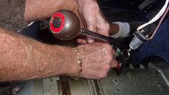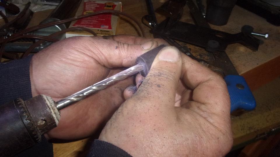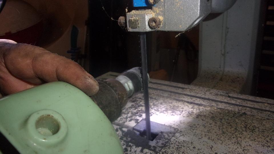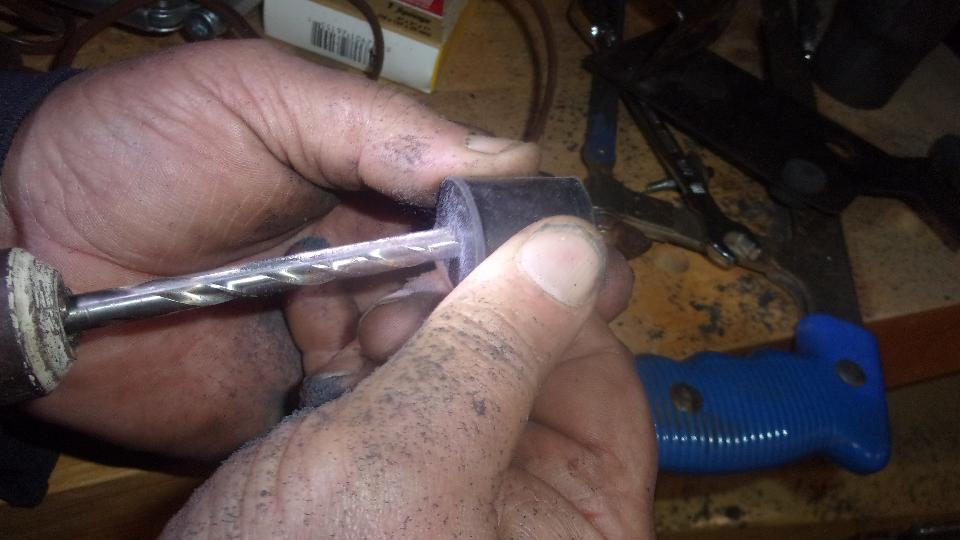 Clamp the hand power drill in the carpenter's vice with a 1/4" drill bit, and drill carefully on center from both ends to meet in the middle, making a press fit 1/4" hole in the rubber stopper. Mount the "cork" on a long 1/4" bolt with flat washers and a hex nut, and chuck it up in the hand drill. From here you can grind it down to desired diameter with a coarse hand file or a hack saw blade or circular sander while it is spinning. This time we took advantage of a small wood working band saw running to remove material from the stopper, hand sculpting it to correct diameter, adding the center groove, and cutting it off to correct thickness.