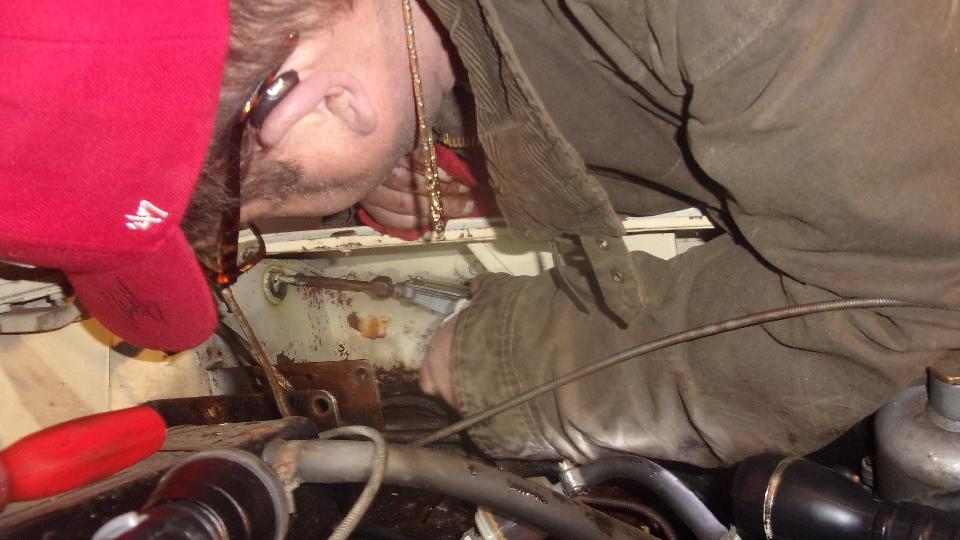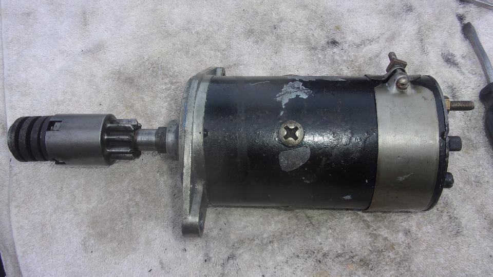 Reconnect hose to carburetors, switch on, fill carbs, no leaks, time to try firing it up. Twist key to start, loud click from solenoid, but no cranking. Poking around with test light reveals the solenoid working fine, and we had power to the starter motor input stud, and good ground for the starter and engine, but no cranking. Bummer, dead starter motor, and we will not get to hear this one run today. Leave owner and his son to remove the starter motor while we head off to another task.