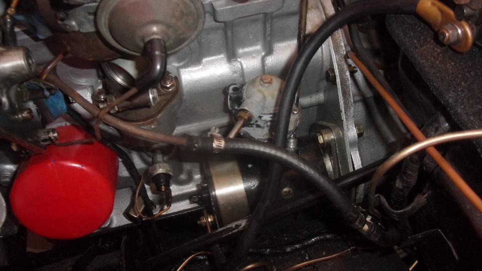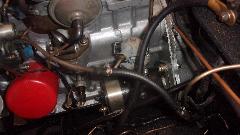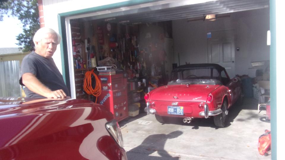 Up early, another hour south to the Gulf coast, short stop for breakfast, and we met Charlie Schott at the car club shop space in Panama City, Florida. Another phone call, and we re-route to visit Bill Wright east across the bridge but also in Panama City. Bill has a TR Spitfire. Report is it cranks but won't run, unless it gets a whiff of starter fluid. This might be a side effect of stale fuel. Also a report the it may run for a block or two and then quit, which sounds like a fuel supply issue. So we wanted to checked fuel flow first. I found the original mechanical fuel pump had been bypassed, and a new electric fuel pump with a small fuel filter had been added in the boot. No need to start the engine yet. Pull fuel hose off the carburetor, hold it in a bucket, switch on ignition, listen to the electric fuel pump running, but only a few drips of fuel came out up front. Okay, fix the fuel supply problem first.