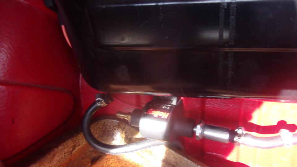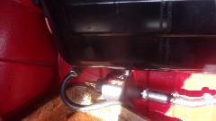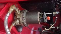 Pull hose off output side of the electric pump to give it a try, but only the tiniest trickle here. Pull hose off of inlet side and plug it. Unscrew fuel filter and blow through it, resulting in free flow, no obstruction. Really? Must be a clog in the tank. Remove plug from hose right under the tank, and get only a tiny dribble. Blow hard on the hose, more than once, and finally get bubbling into the tank, and then a flow of fuel out. Lots of crud in the tank, to be fixed later. Put the hoses back on the fuel pump, switch on to check fuel flow up front, and get nothing. Say what? Has to be another clog in the pipe from rear to front. Pull outlet hose off pump,and blow hard on the hose, no flow at all. Fire up air compressor, and apply higher pressure to hose on pipe going forward. First try, no flow. More diligent second try finally produced a loud POP followed by a slug of fuel and rusty sludge up front. Ah, finally a clear pipe. Reconnect hoses at fuel pump, switch on and get plenty of fuel flow up front. Bet still needing to have the fuel tank cleaned.