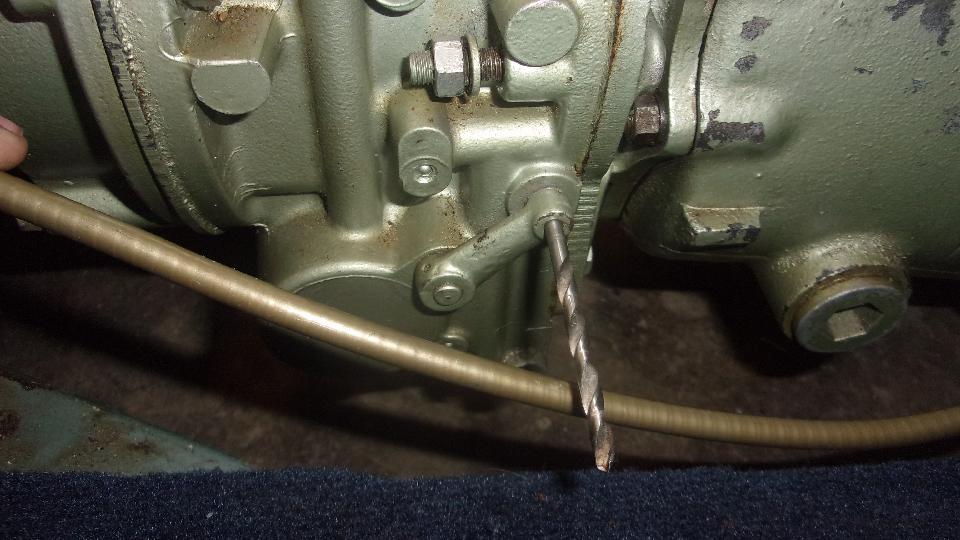 We spent some time sorting through the wiring diagram again, thinking there must be an error in the Brooklands Manual wiring diagram where it shows thd kick-down switch connected in parallel with the manual OD switch, so OD would never switch off. Disconnecting one wire on the kick-down switch disabled the switch, but allowed the manual switch to operate the OD solenoid, but OD still didn't work. When the accumulator was replaced the linkage for the solenoid had been fiddled with, so we read all instructions and reset the adjustments, but it still didn't work. This one has a cross shaft to operate a cam inside with solenoid arm on left and an alignment arm on right (notice drill bit used to fixture the alignment arm during set up adjustment).