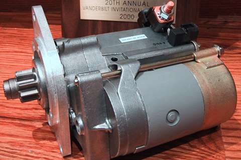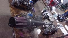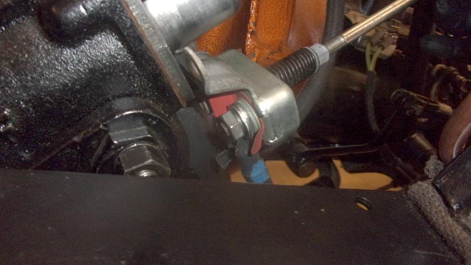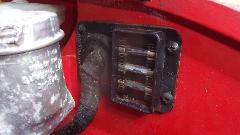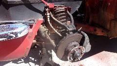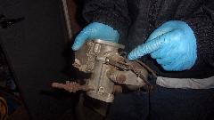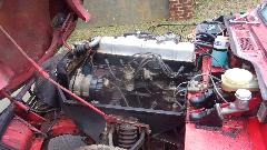 apart when dismounted, so spent some time getting the brushes realigned during reassembly. Another step on the starter gave about 4 volts across the motor, but still no cranking. Duff starter. So we pulled it out to test with jumper cables, still no go, and installed another new starter that did test good (nice to have extra spare parts). Then it cranked over okay, but still no fire. Also the front carburetor was gushing fuel all over, so we pinched off the fuel hose while we were investigating lack of spark.