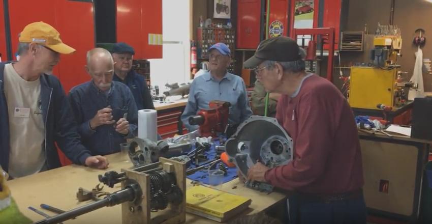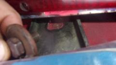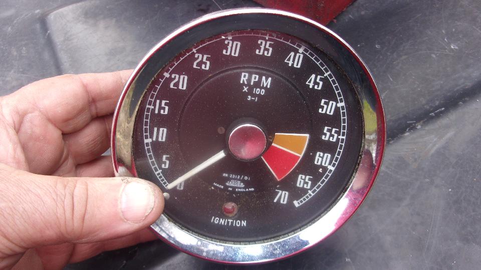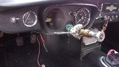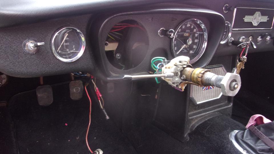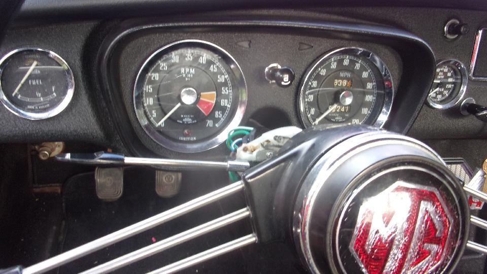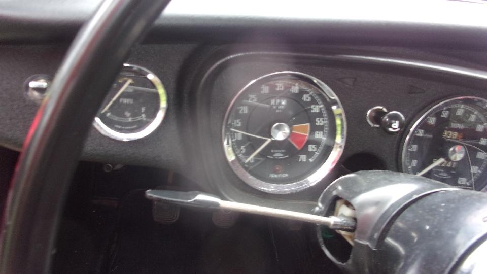 Then on to the tougher job for the day. The red pull handle MGB belongs to Jim Walton. Problem here was a mechanical tachometer that wold scream like crazy, especially when cold, and then it quit working. Okay, check the drive cable first. Too much trouble trying to work under the large original steering wheel so we paused briefly to remove it. Getting the cable unscrewed and dropped below the dash where we could see it, we started the engine, and the cable was rotating. So it looked like a good cable, and time to remove the instrument. Nearly there when we found the plastic cowling around the turn signal switch was in the way and had to be removed before the tach would come out of the dash, but such is life.
