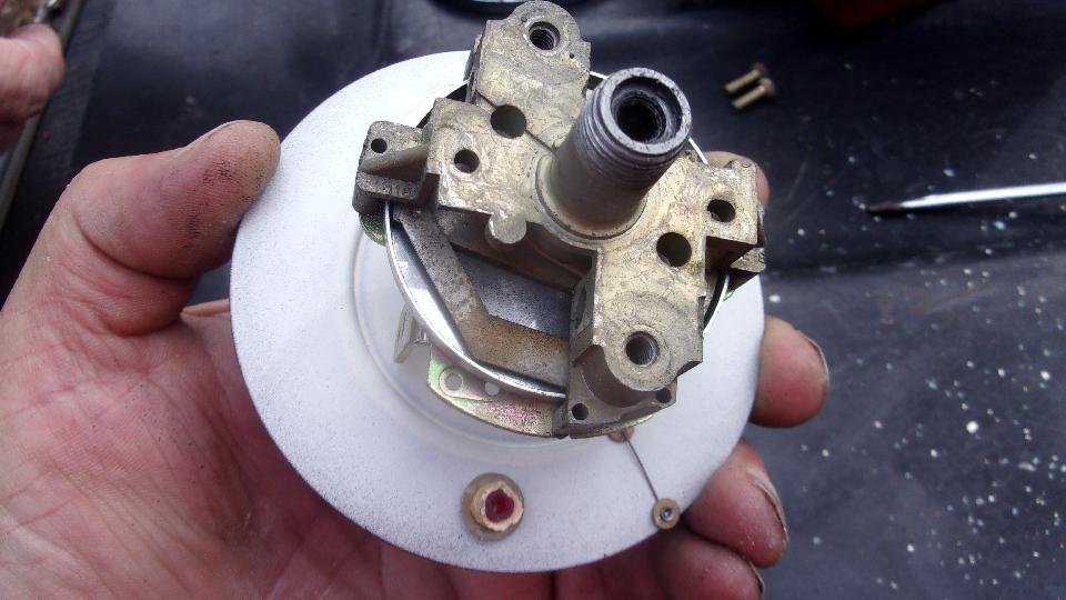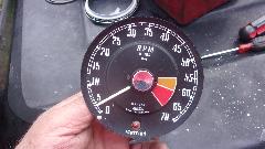 Turning the input with a small screw driver created a notable squeaking noise. We could have tried oiling the input shaft sleeve and put it back in the car, but after all this effort it seemed prudent to open the instrument to oil a lot of little joints inside. Tough time getting the trim ring to move, but ultimate success. Face trim and glass removed, two screw out of the back, and the works drops out the front (with a little encouragement).