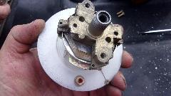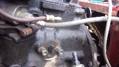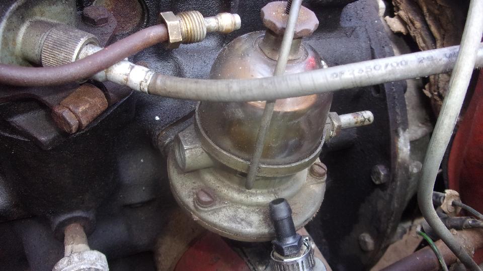 couple hours. I tried gravity feeding fresh fuel to the fuel pump, but no-go, no fuel to the carburetors. Disconnected the line before the carbs (breaking up another hard rubber hose), but still no fuel when cranking. Disconnected the pipe from pump outlet port, blew through the pipe, and it was clear, so back to the pump. Manually operated the mechanical pump hand lever to fill fuel into the top side filter glass bowl, but still no pump output when cranking, so put a new fuel pump on the shopping list.