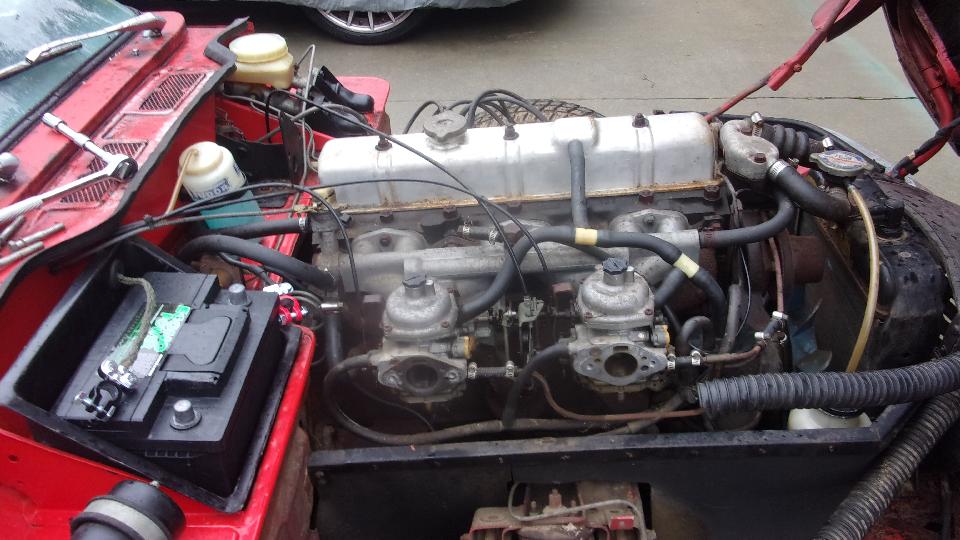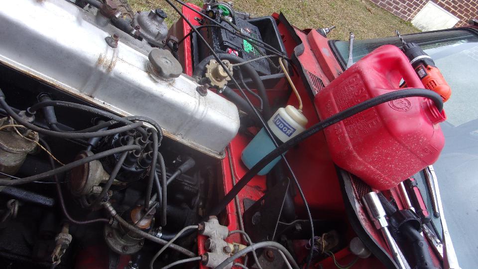 There was a new battery, and after getting the cable clamps tight it cranked the engine over okay. First cheer. Disconnect the fuel line from the fuel pump input so it couldn't pump stale fuel into the carburetors (breaking the brittle fuel hose in to pieces). Gave it a shot of ether while cranking, but no go, no spark. Cleaned and adjusted the ignition contact points, gave it another shot of ether, and it fired up and ran a little bit. Second cheer.