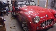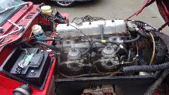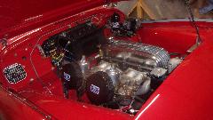 Also an MGB race car with bolt-on hard top, very wide fenders, and I think maybe no roll bar (from back in the day when it may not have been a requirement). It has a vintage HRG cross flow cylinder head and matching HRG intake manifolds for dual Weber side draft carburetors. This is one of Tim's earliest cars from a much younger age when he was on the learning curve for racing. It is predecessor to his TR addiction, a beloved family member never to get away.