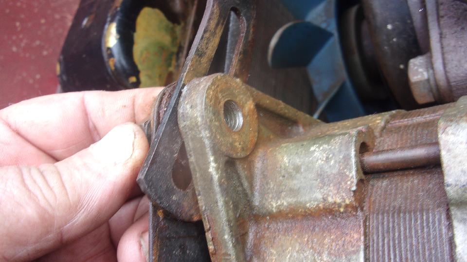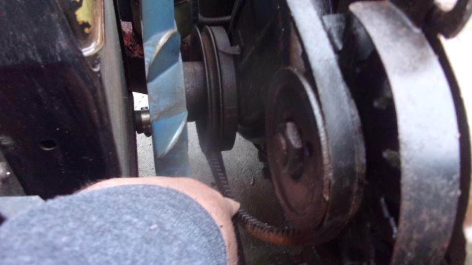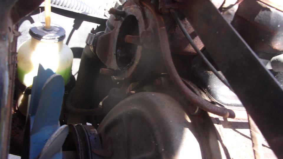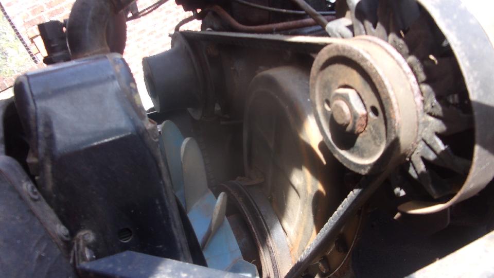 Fan belt was loose. Some DPO had installed a coarse threaded bolt and stripped out the threads. Not too long to install a Heli-Coil for a fresh thread, after which I got the belt tightened. With a little more cranking the belt was squealing like crazy, water pump frozen solid, not turning, so put that on the shopping list (and loosen the fan belt before going on).