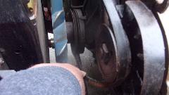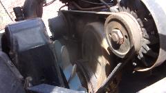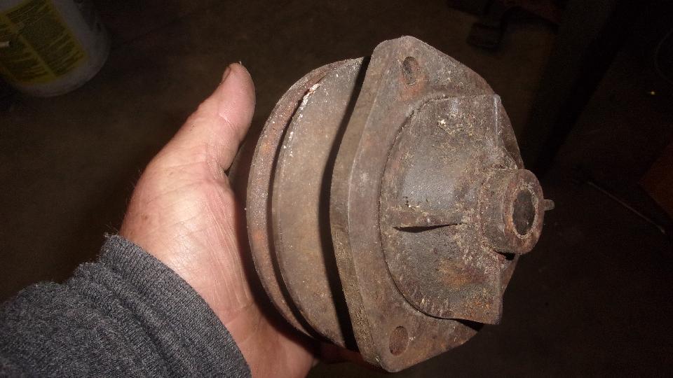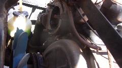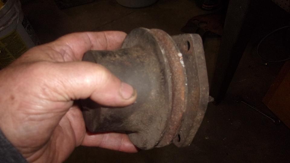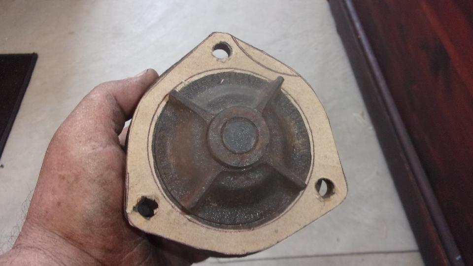 Then on to installing the good use water pump, donated by our friend Tim Melton last week. Relatively easy chore for a change, don't even need to remove the radiator for this one. Remove three nuts and give the pulley hub a good whack with a hammer, and the old one was off. Rather ugly rust accumulated there, dug a small hand full of the stuff out of the cavity around the pump impellor. Cleaned off old gasket residue, made a new gasket from some thin cardboard, and the replacement pump was install in quick time.