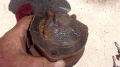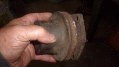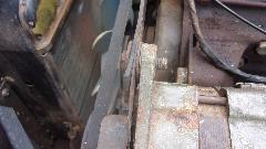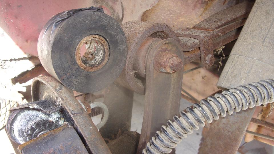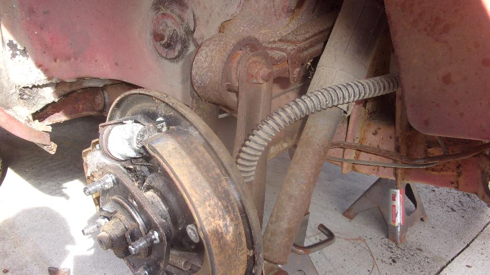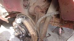 Yes, brake shoes were rusted to the drums, but otherwise both shoes and drums were in pretty good condition. Coarse sanding for the linings of the shoes, and fine sanding inside the drums, call it good to put back in service. Wheel bearings good, and no leak at the bearing seals (yet), so skip those issues. Self adjusters work when the hand brake is pulled, and the hand brake relaxes when released, all good, just wind the adjusters back a turn or two. Hard on the brake pedal, slave cylinders do not move. Open bleed nipple, and fluid does escape, so put new rear save cylinders on the shopping list (and also rear hoses since we have a good idea how old they are). Rubber bushings in the rear spring eyes are non-existent (common problem), so put those on thr shopping list. Elliott thought he saw a new rubber bushing in the boot, found it and pulled it out. It turned out to be a roll of wide electrical tape, good for a laugh, but a possible lead-in to another Grapes Of Wrath repair.