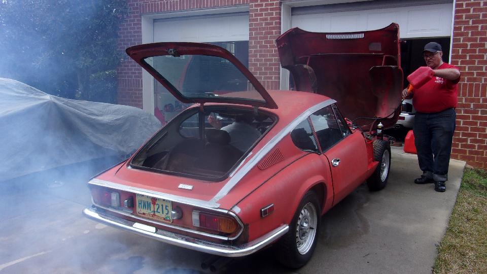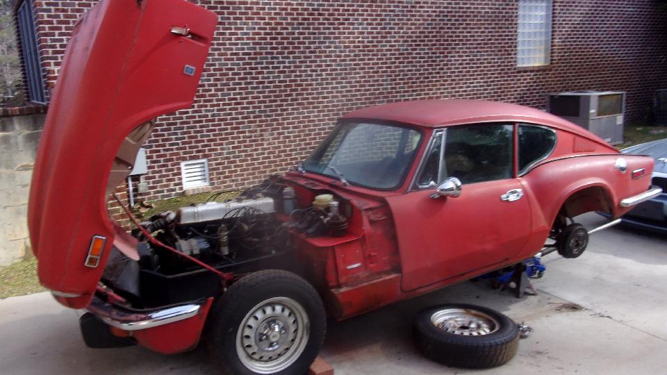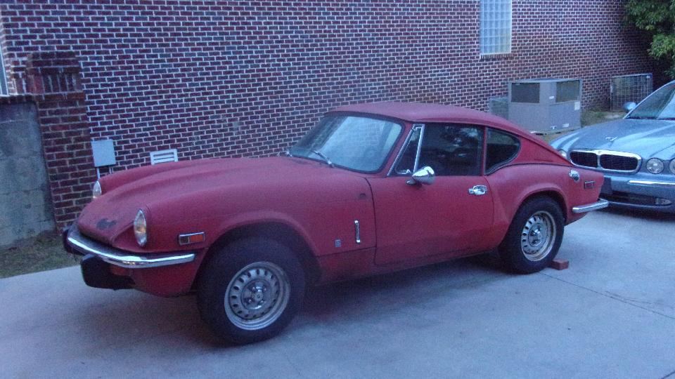 Sitting in Lexington, SC. Got a bit of reprieve from the rain this morning, at least until noonish when the next storm front will move in. Now the new phone was going nuts. For any phone call incoming or outgoing I could talk and be heard by the other guy, but I could not hear any incoming voice. Super bummer. Revert to email messages for communications. We finally got contact for morning appointment, and did a quick 25 mile sprint to see Elliot Cox at the far east end of Columbia, SC. Been here before, and you might recall he likes Jaguars, an E-Type in the garage and four sedans in the driveway (two looking for a new owner). He recently procured a Triumph GT6+ that likely needs more work than he anticipated, since it has been dormant for a dozen years since there was any shop work done on it. More to the point, I think the latest license sticker was from 1986, maybe off the road 34 years.