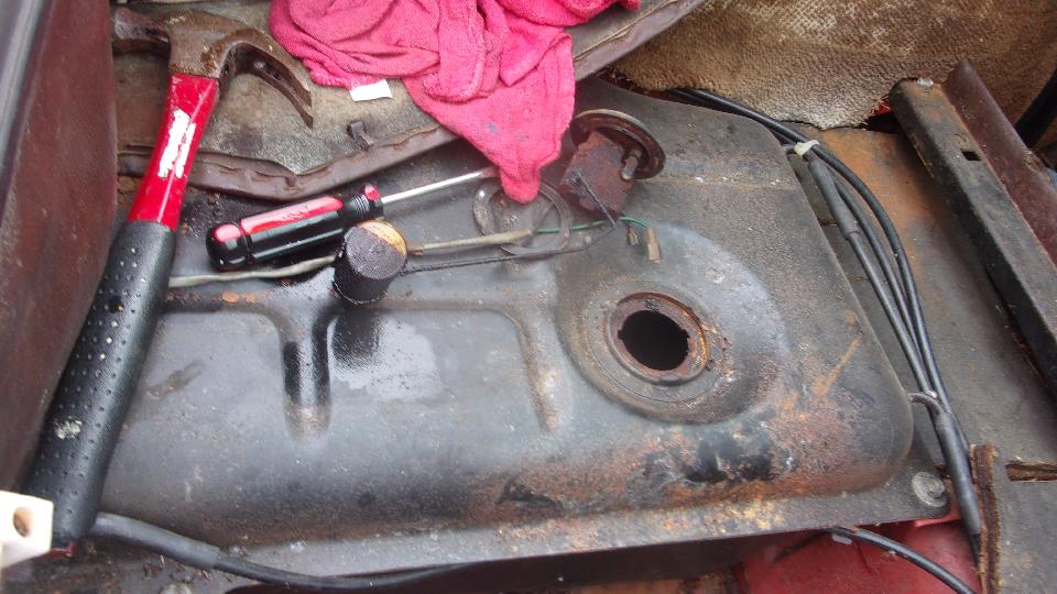 Checking out the fuel tank, removed the fuel level sender unit to find it all rusted up and seized solid, and fuel dribbling out of a hole in the plastic float, so put a new sender unit on the shopping list. Less than an inch of slime in bottom of the tank smelled like turpentine, and the inside of the tank was all rusted like the sender unit, so the tank will have to come out and go to a radiator shop for boiling out, or maybe buy a new tank (job for another day).