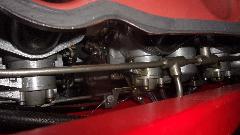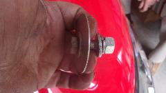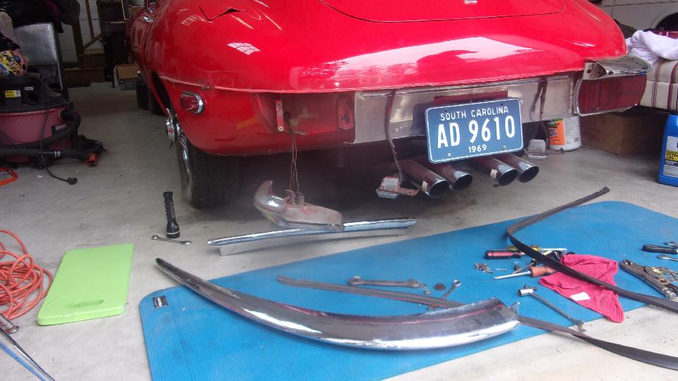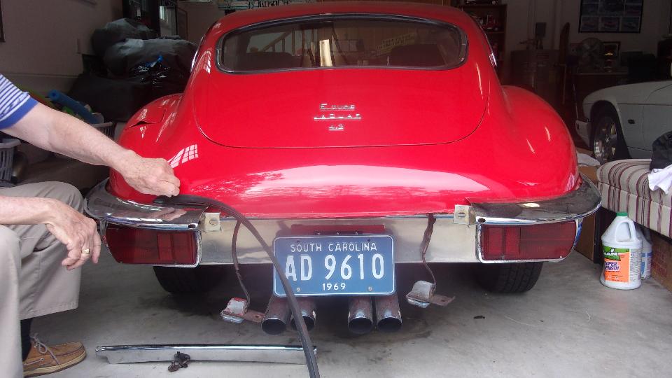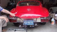 Then we got on to the primary task for the day, to install the rubber seal at top of rear bumper on the E-type. I wasn't expecting this to be particularly easy, but this just kept getting more ridiculously difficult as the day wore on. The parts were only loosely bolted in place, so we removed the center bumper section (and back-up lights) first, in order to push the rubber packing piece into place starting inboard and pushing it around the bend. That was easier than expected, until I ran into a cross threaded bolt with incorrect thread at the end of the bumper around left side at the wheel arch. Also the primary attachment bolt at the back was above the tail light where it was inaccessible for any wrench without removing the tail light.
