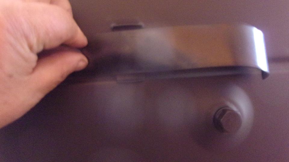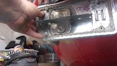 Then on the right side the midway captive stud was missing (actually broken), with the spot welded reinforcing plate broken away from the inside of the fender. Solution here was to install a bolt with a large fender washer inside. I wanted to bond it in place with JB Weld, but was over-ruled as time expediency, so Elliott was holding the bolt and wrench inside as I was installing the washer and nut outside. The right side tail light had to be removed as well, and the side bumper sections bolted up tight and rubber seal installed before installing the center section. Then a little tussle with the overriders and packing strips. Also bolt on the back-up lamps, and finally tighten all of the bolts, and the bumper looks great (always better after it is finished). Then more head scratching for installing the right side tail lamp, a piece at a time, and working in the chrome trim cap on the outboard end. Some masochist designer must have been working overtime on that one, figuring out how to screw the field mechanics, but we finally won that battle as well.