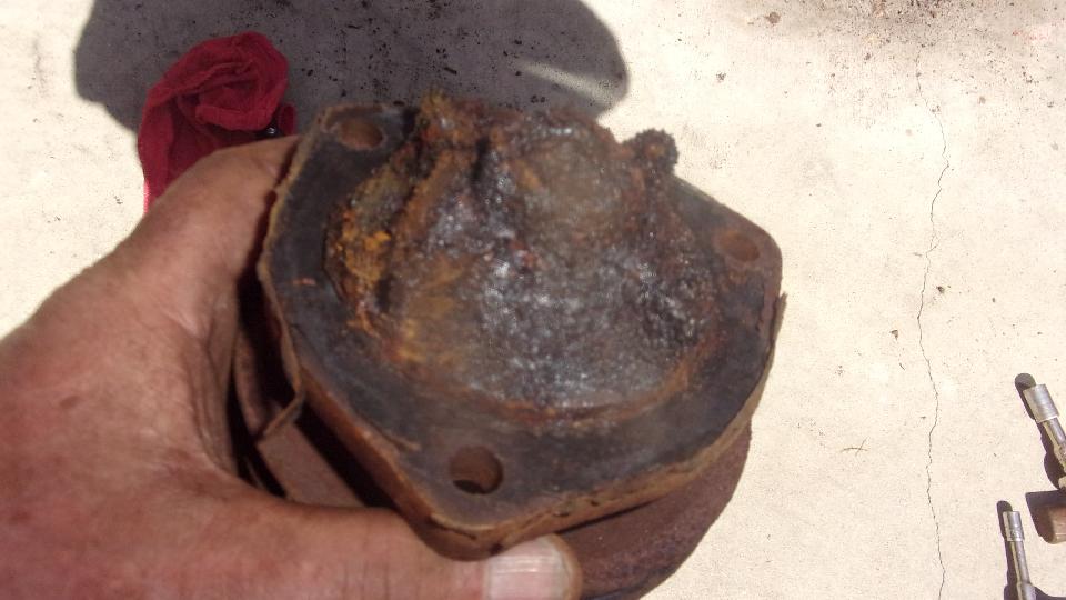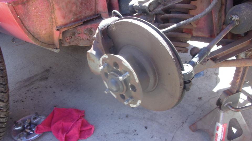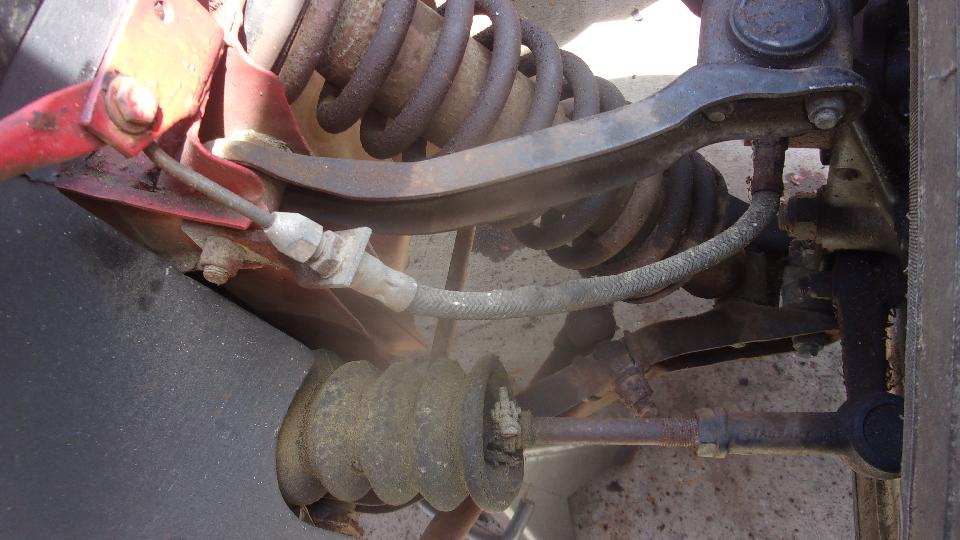 Brake drums and wheels back on so it will roll, drop the rear and hoist the front. Elliott swears the front wheels turned when the car was towed in and moved around a bit, but they sure don't tun now. Thin screwdriver and hammer used to separate brake pads from rotor, and the wheel turns. Step hard on the brake and release, and it seized up again. Open bleed nipple, little fluid released, brakes still stuck, so add caliper rebuild kits to the shopping list. Front brake hoses were blistering on the outer cover, not only old be obviously failed, so put those on order Steering rack gaiters were shot, so order up new ones.
