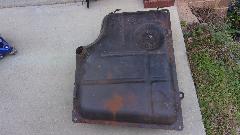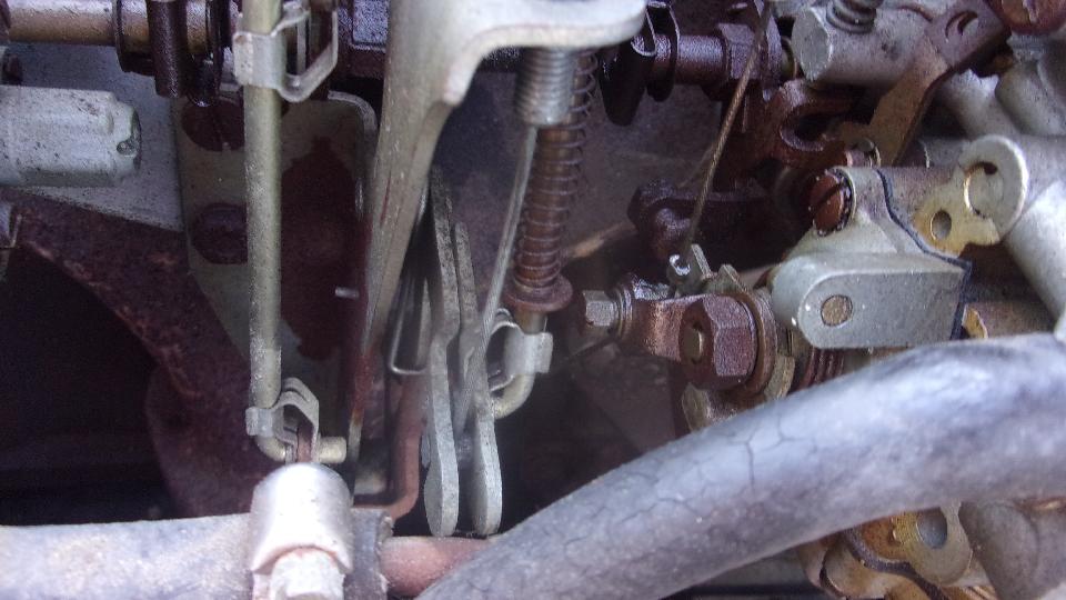 Casual inspection of throttle linkage with an odd mechanism to reverse direction from pull to push, and manual choke with one knob pulling two cables. Only a little tussle to extract the fuel tank, three mounting bolts right on top, one fuel pipe on bottom, and three vent hoses (air bubbles not not be allowed). Gawd that half gallon of crap left in the tank smelled horrible, not to mention all the rust inside, but it looks like a good solid tank, so see if we can find a radiator shop to boil it out (and put a new fuel level sender unit on the shopping list).