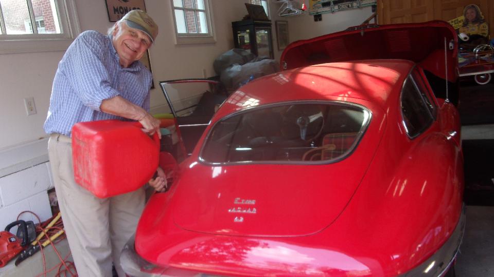 Get a bucket, put a hose on the fuel pipe, run fuel pump to empty the tank (two buckets full). Quick trip to fetch fresh gas and refill a few gallons. Another sniff of ether to get it running again, continue a little ether for a couple minutes until fresh fuel got to the engine, and it was running on its own. That was the worst case of stale fuel I have seen in years, considering it is supposed to be a driveable car. Settling down to a purr after a few minutes, and out for a short run around the block, back with a big smile. Got a different job for tomorrow.