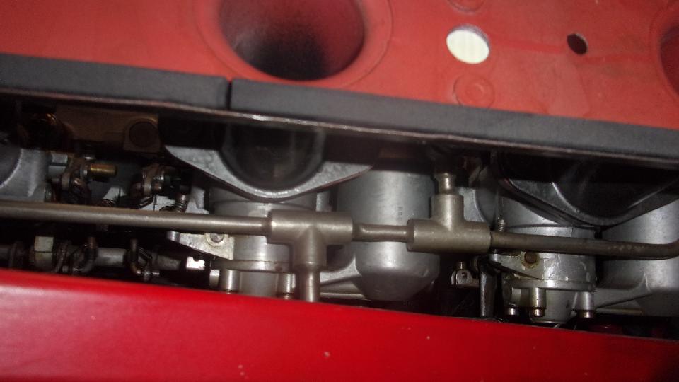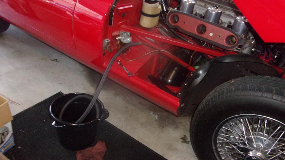 Time for a look at the E-type to see why it won't start. Crank, crank, pop, crank, no fire. Lots of choke, crank again, still no fire. Give it a little sniff of ether (starting fluid), and it fired to life for a few seconds, then died. We could keep it running the periodic shots of ether, but died immediately without it. Electric fuel pump works fine, and plenty of fuel flow at the filter before carbs. So I asked Elliott when is the last time he put gas in it, and he didn't know, but apparently a long tome ago. Okay, so it must be very stale gas.