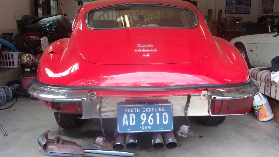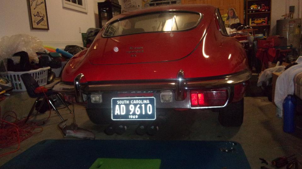 Back at Elliott's to finish installing the last tail light on the E-type. Knocked that off in two hours, including hunting up a few replacement screws. Electrical checks, brake lights and turn signals work, so at least safe for daytime driving. No parking lights or headlights or hazard flashers. Elliott is pretty sure it is fuses or a wire disconnect or a switch failure behind the dash, easy access with two screws to tilt a panel forward (did they really do something right?). So that was it for now, we were excused (he actually had something else to do). Sorry I didn't get the final picture, but that rear bumper and tail lights look real good (especially good feeling after it's all done).