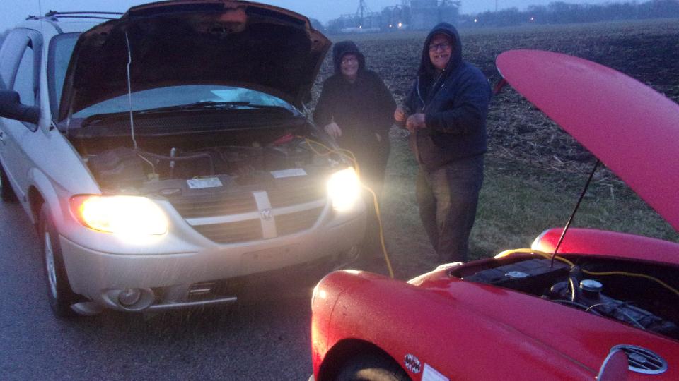Oops, slight revision. 80 miles south from Naperville, one mile short of Piper City, IL on IL-115, we were on side of road with a dead battery, failed alternator. Reason we were caught by surprise on side of road is because the ignition lamp was not working (since one day after the alternator was installed) due to a fault in the internal regulator in the alternator. Third Lucas alternator failure in two years, this one ran 4-months, 7915 miles. It was likely running dead for the last 100 miles with lights and heater blower on. the amazing thing is, 45 minutes earlier it cranked up just fine after a fuel stop, and the battery must have been quite low then. Of course we carry a spare alternator in the trailer, can't trust a Lucas alternator as far as I could throw it.