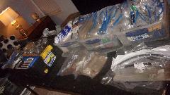 Then on with the grunt work, playing musical chairs with the baggies to convert 3 overstuffed tote boxes to 4 comfortably stuffed boxes. Now one more tote box, but we have reorganized a few shopping bags of small parts, tossed out one relatively large cardboard box and one defunct timing light. The large yellow cover box contains a bunch of large flat gaskets, a tackle box size tool box, one alternator (defunct awaiting replacement as a spare) Two used distributors (long story), some larger rubber parts and a large baggie of small specialty tools. There is still a power stapler sitting loose, but I think it will fit in the other large box in the trailer. Now we can find stuff when we need it.