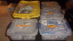 around in shopping bags. That made it extremely difficult to find any part when we needed it, wasting lots of time searching and sometimes not finding it. So we put all of our tote boxes on the table and began by filing away all of the disorganized parts we had BEFORE the new orders. That took a few hours.
