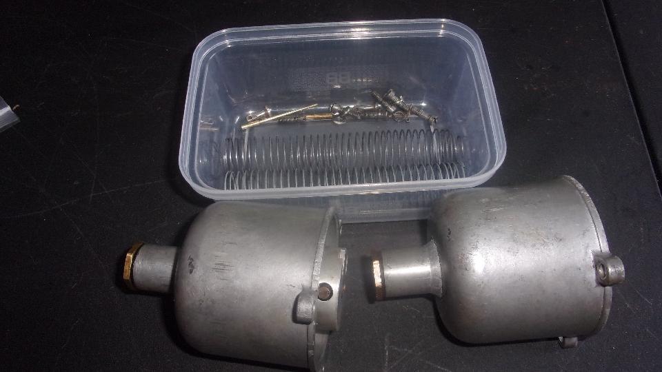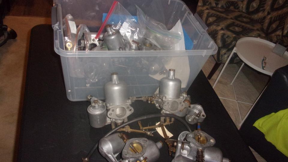 We had a look at three sets of SU carburetors, two of them 1500 style, and one set 1600 style that came from our friend's MGA 1600- MK-II. Just a check over today with some discussion about what's good, what might be work, what parts may be needed to restore one set, and I think we have all of the necessary parts in the trailer (except maybe throttle shafts). We intend to get after these later.