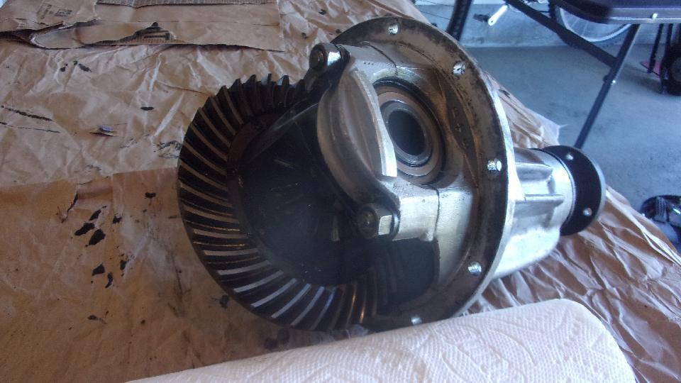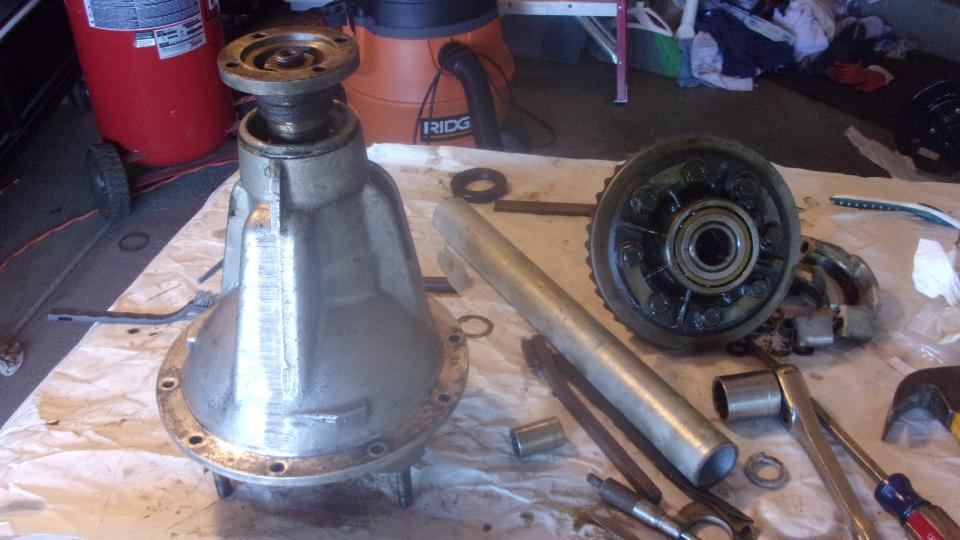 We took after the differential first, wanting to change the front seal and adjust the input bearing shims for slight preload. The assembly took a short trip down the street to have a friend loosen the front nut, since we didn't