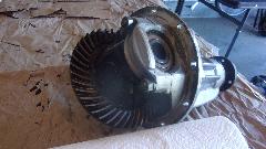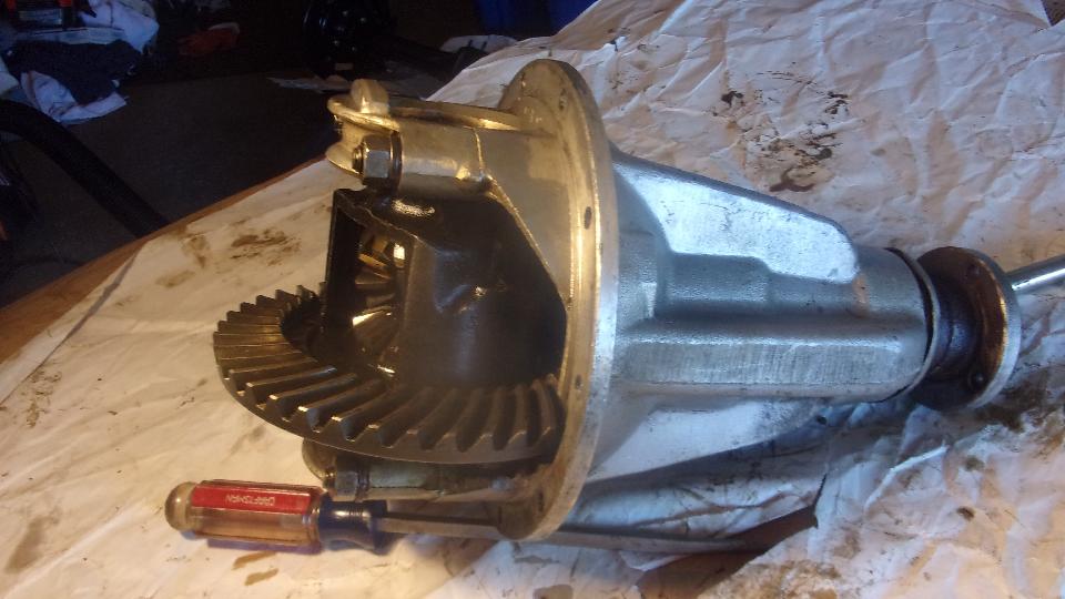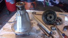 have an air impact wrench handy. Then the front yoke needed some encouragement to come out, and the front bearing was even more stubborn. So we removed two main bearing caps from the back to remove the ring gear and differential gears assembly. That cleared the way for tapping on the front of the input shaft to drive it out the back, leaving the front roller bearing in the housing.