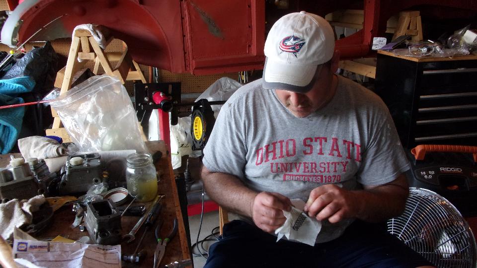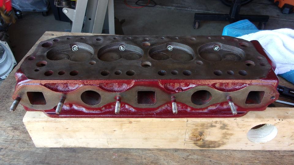 Hot day in Columbus, Ohio for the first day of summer (high temperature 92dF). And it was a work day (play day with Marc Chapman's toys). After breakfast, out to the garage to look at his MGA 1600-MK-II in process. The "16" cylinder head was off the engine, so we started with an inspection. Flip it over and prop it up level, pour water in the combustion chambers, and wait. At first it seemed to be perfectly fluid tight, even though he knew one cylinder was low on compression before disassembly. After five minutes #1 exhaust valve left a drop of water in the intake port, and another drop half a minute later. Not perfect, but very good.