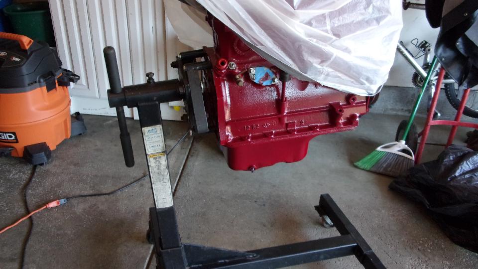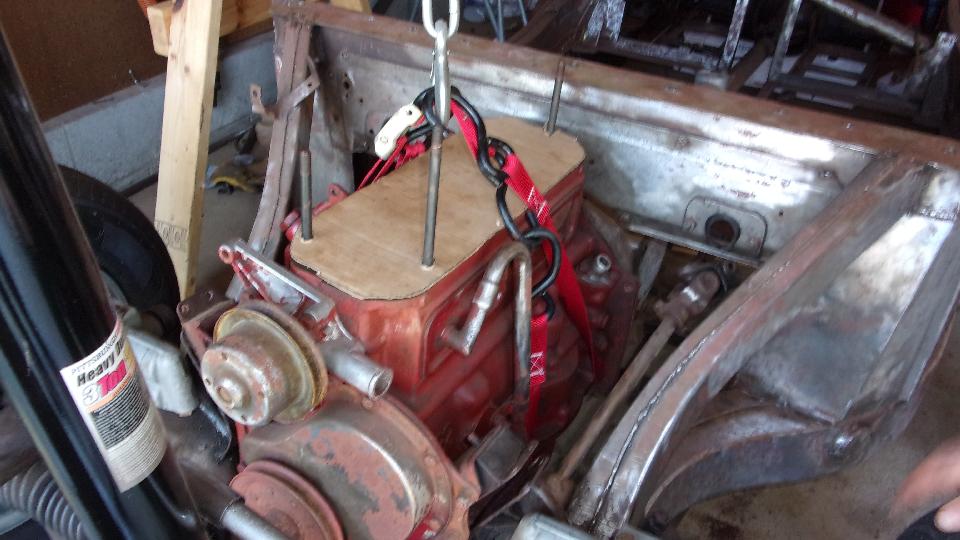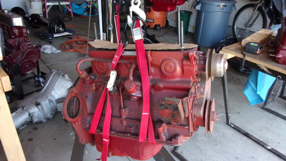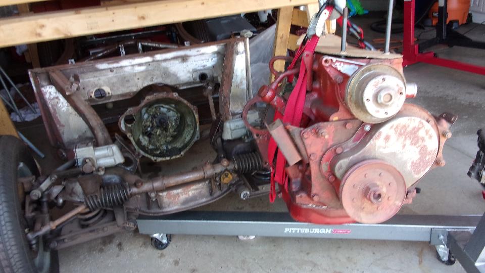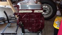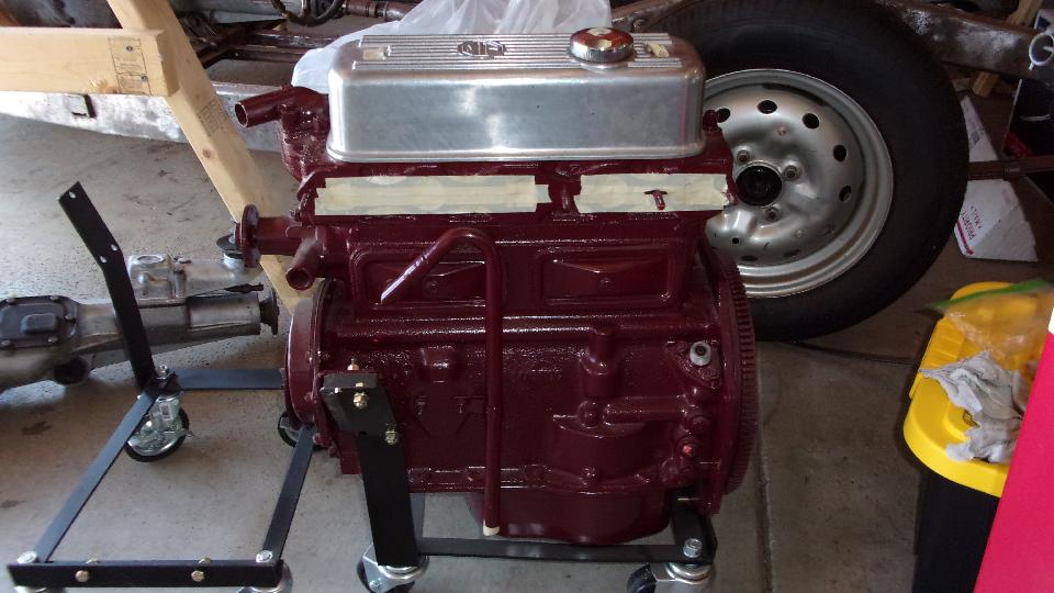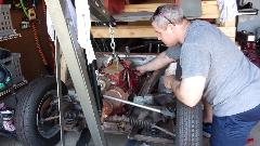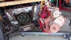 Then I got distracted for a minute taking picture of two other 1600 engines, freshly painted. One is from a second MGA that may eventually be restored for Marc's father. The other was a spare picked up for cheap, one of those deals you just can't pass up, and it may be sold on to someone else who may need it. Truth be known, I was more interested in two engine stands and two roll around engine dollies. But then we got back to pulling the 1622 engine out of the rolling chassis. Not a big deal, just remove the hanging canister oil filter, loosen two engine mounts a several bolts in the bellhousing.