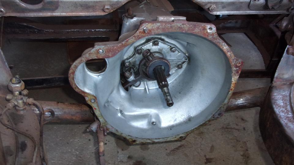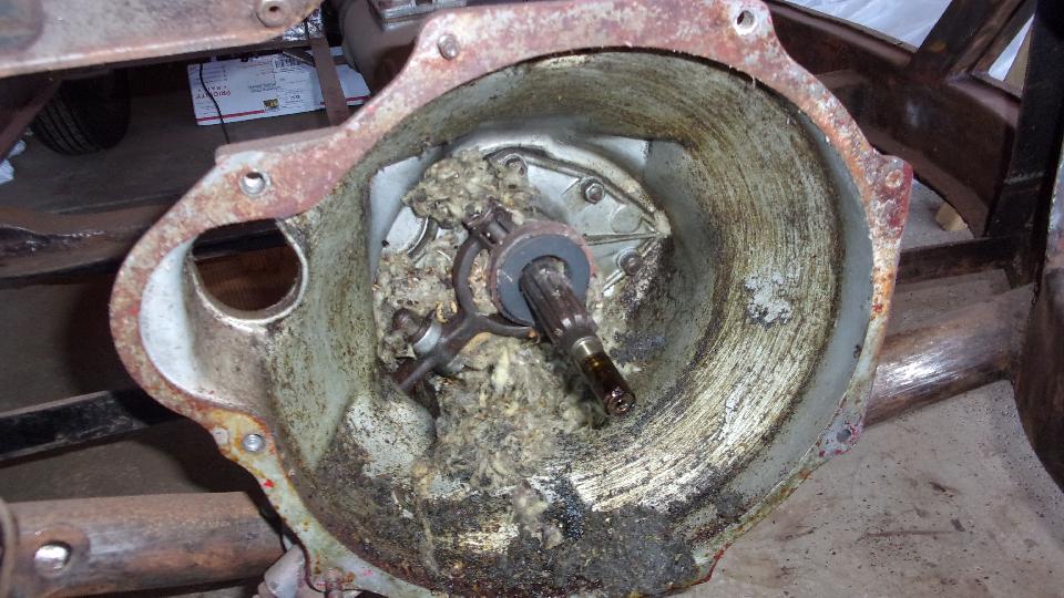 Not long to lift the engine out, immediately revealing the big mouse nest composed mostly of building insulation. Marc already knew about this from prior inspection, when he noticed the clutch release arm rubber boot was missing. But the quantity of the stuff inside was still a surprise.