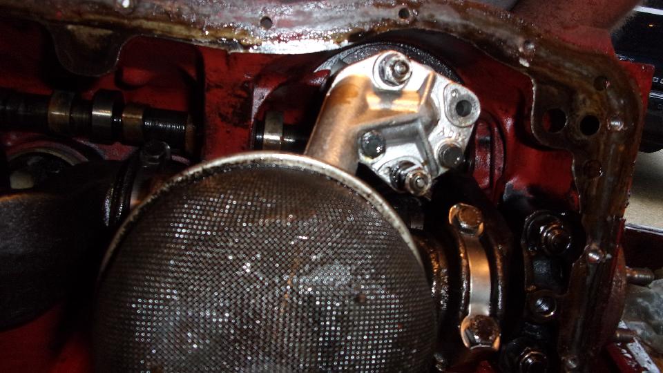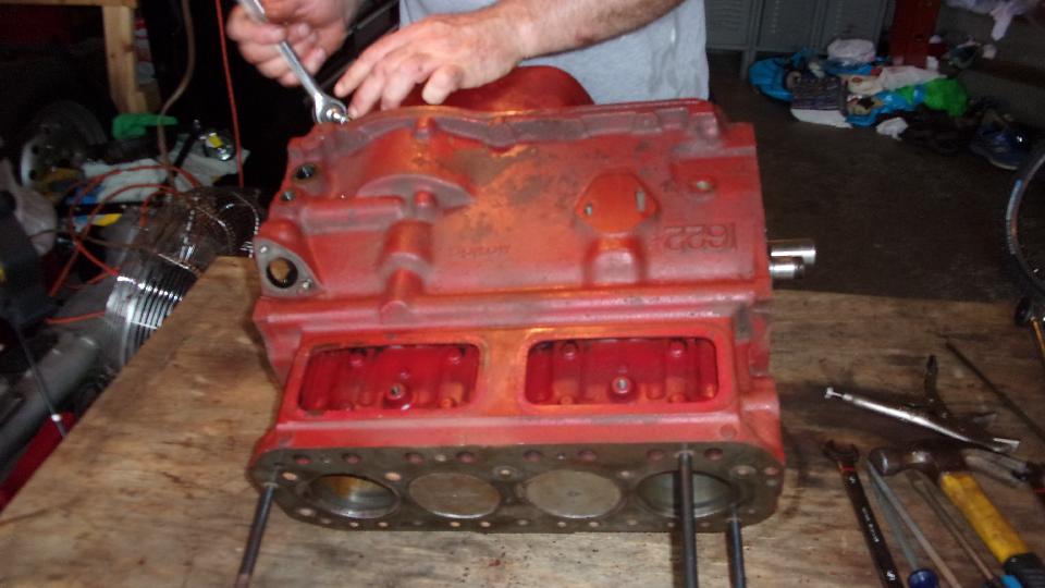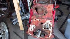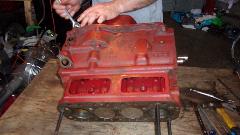 disassembling his engine, and start by draining the oil. Still needed to remove the rear plate and a few bits on the right side, like coolant drain cock and distributor mount. Then we decided not to waste time putting it on the engine stand, just set it on the table, roll it over on its side, remove the sump, and proceed to disassemble it. First surprise was one of the oil pump mounting studs was missing, and it was not in the sump. Cute. After extracting the oil pump we removed the the camshaft and proceeded to measure the cam lobes, finding a couple of them worn down 0.020" to 0.030", so put a new cam and tappets on the shopping list.