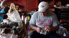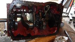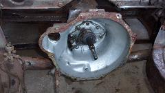 We had a late lunch break, but didn't get back to work much more, except Marc was cleaning up the bellhousing (nice job there). Then Marc was showing off his original sheet steel front valance panel. Not as nice as it looks in the pictures. This one has a lot of creases and ripples in it from being bent and straightened, maybe more than once (quite common). Time to call it a day.