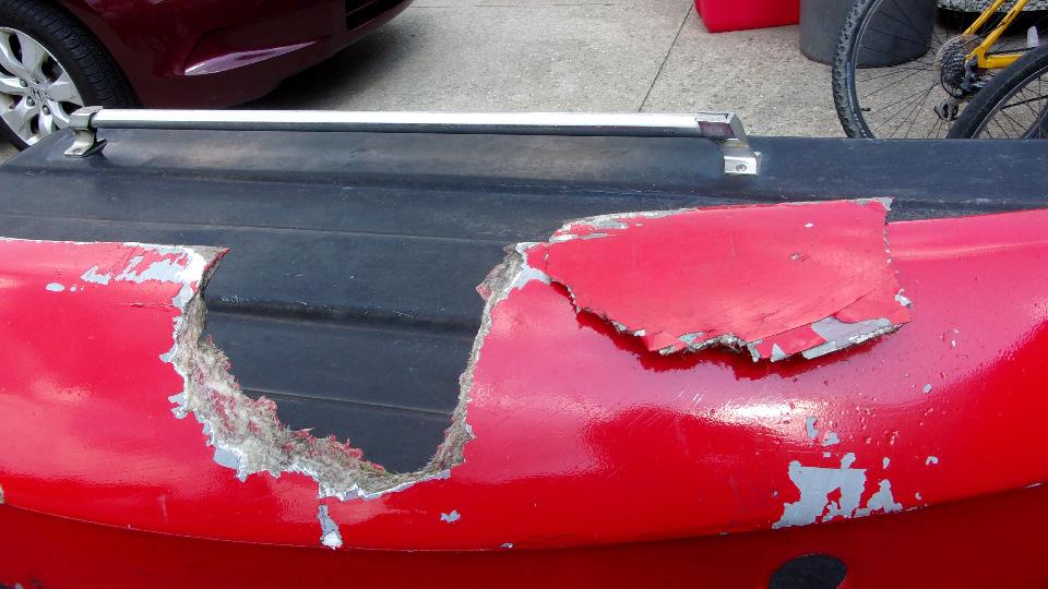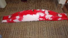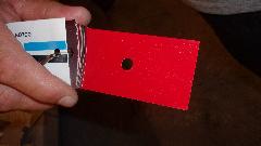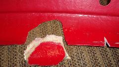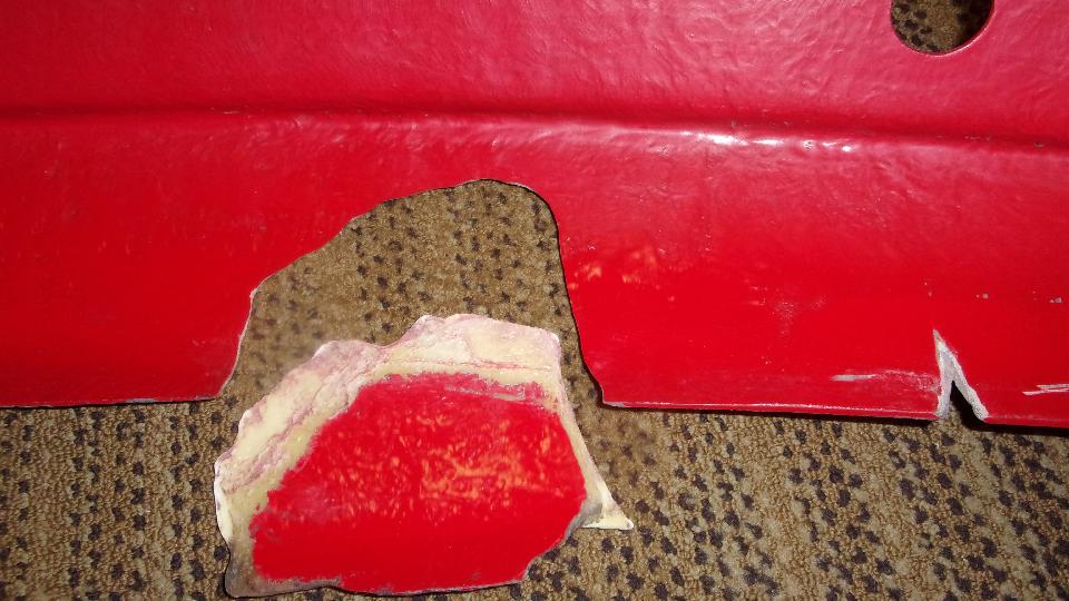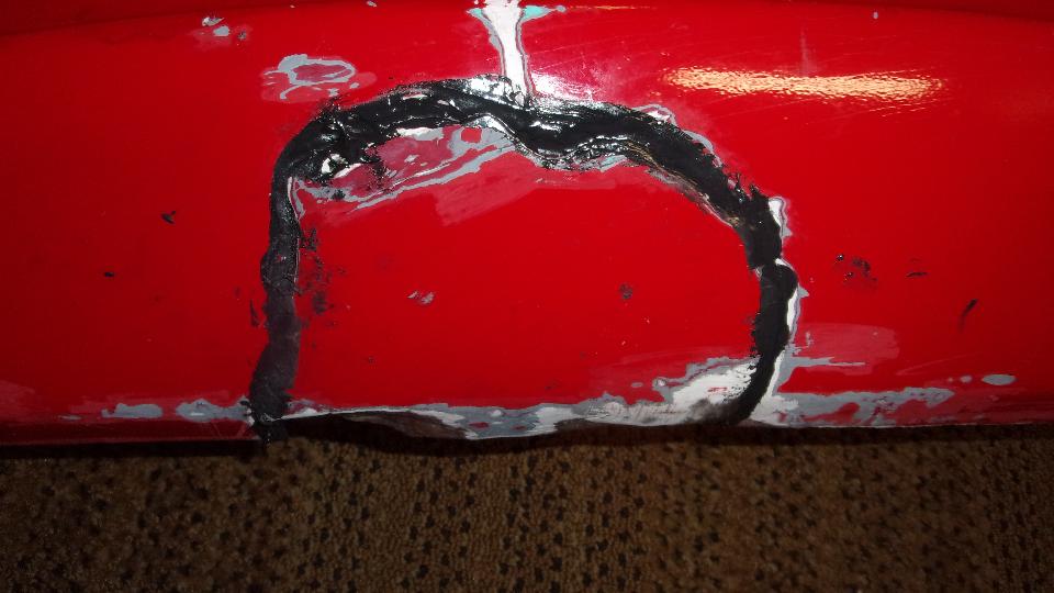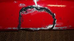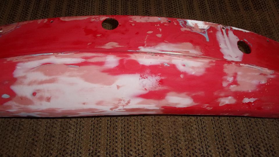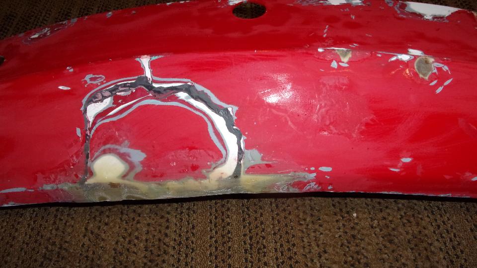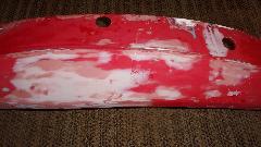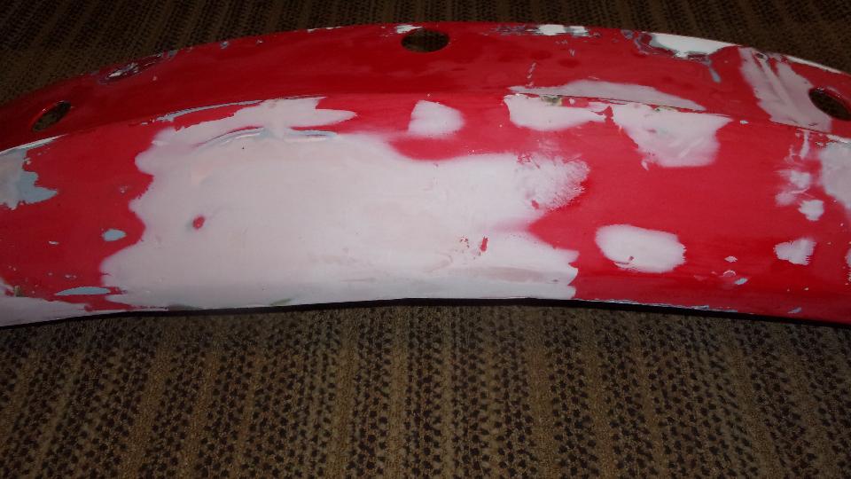 Then I was into wet sanding, more pleasant as it makes slightly muddy red and white water rather than dust in the air. Using 320-grit paper on a sanding block, sand a little, rinse the paper, and repeat until getting down to the primary surface to feather the edges. Wash and dry, then on to a bit of spot filler squeezed out of a tube like tooth paste. That stuff contains several fast evaporating solvents giving maybe 10 to 15 seconds of working time before it begins to clog up on the spreader tool, then wipe the spreader and get a little more of the paste to continue. But this filler is very thin (low viscosity), so it is good for filling pin holes and paint chip divots. Another 20 minutes is enough drying time to either dry or wet sand the spot filler, giving the final smooth surface ready for primer.
