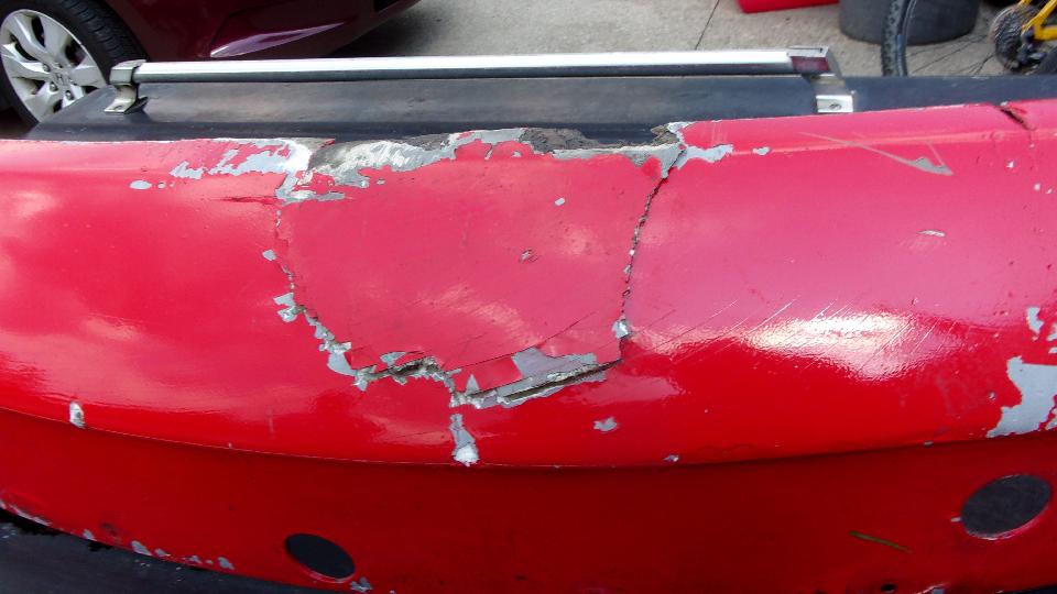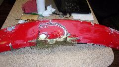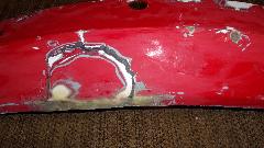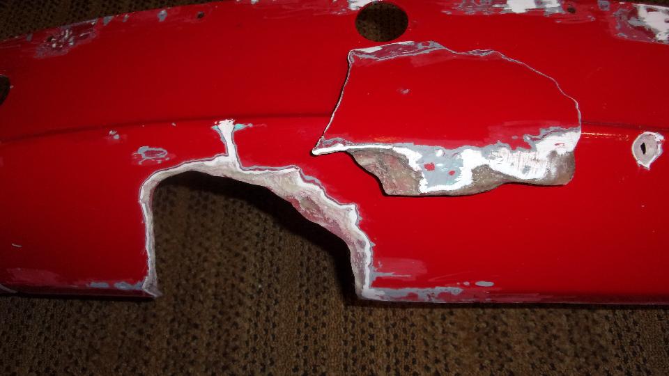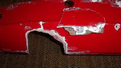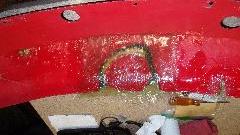 By this time it was past midnight, and I was significantly concerned about clock time to get all this finished in time for morning delivery to the body shop, so keep on keeping on. I used a carbide grit in fiberglass abrasive disc with a Dremel tool to trim the new fiberglass patch flush at the lower edge of the panel, then a little grinding in back to remove any burrs and smooth the edges of the cloth overlays. That was all that would be required on the back side before painting. Then more carefully grinding on the front side to smooth down anything protruding to be flush. Finally mix a little Bondo body filler to spread on the front side for filling any remaining depressions. This was going much better (quicker), as working time with the filler was only a few minutes, so I had to mix and spread a few times, followed by a half hour curing time.