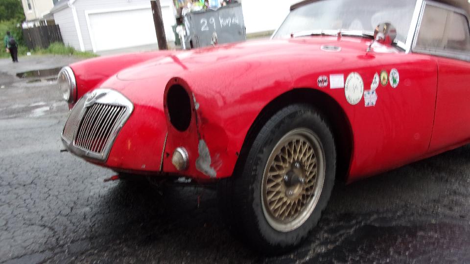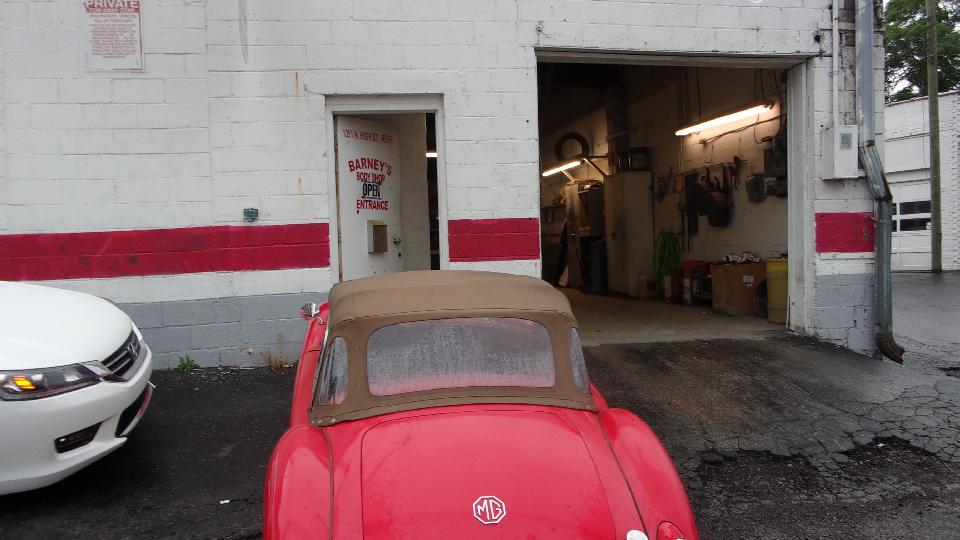 Raining this morning, but have to get out and go. Taking the MGA to Barney's Body Shop to get the LF wing straightened out and repainted. Expect the new paint to be drying late in the week. Friend met me at the shop for return trip to the hotel.