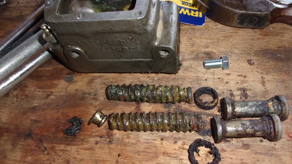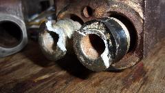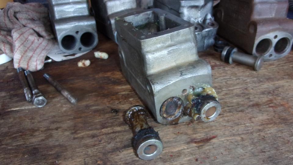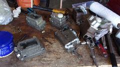 In the end we were mostly winners, as most of the pistons came out one way or another. The joker popped up when one master cylinder had pot metal pistons rather than steel pistons. Would like to kill the DPM who thought that was a good idea (just to clear the human gene pool). These pistons appeared to be half way out of the bores, but were in fact thoroughly stuck. Hitting with a hammer would not budge them a hair, just breaking the ends of the pistons. Untold hydraulic pressure ultimately blew out the cup seals releasing the grease pressure, at which point we called it quits. It would be easy enough to drill out the pot metal pistons, if you have a drill press to avoid drilling into the cylinder bores. But I figure if the galvanic corrosion is that bad, the bores will likely need to be sleeved. Marc was washing grease out of all the liberated parts when it was time to break for dinner.