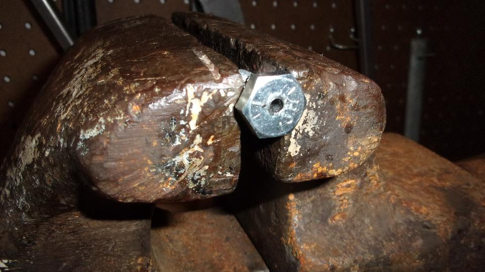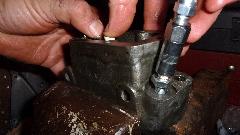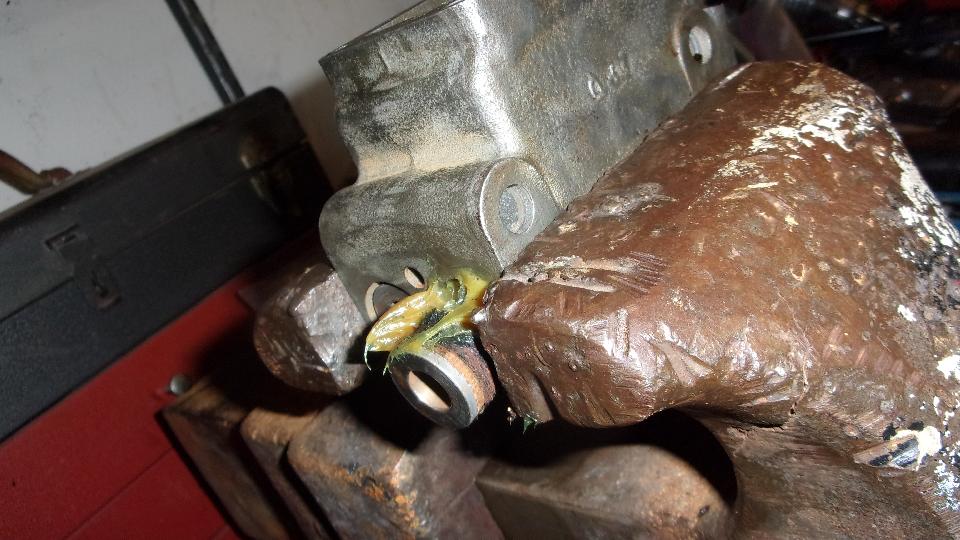 Put a 3/8-24-UNF x 3/4 hex head bolt in the vice, center punch the top, and drill a small pilot hole through the full length of the bolt. Drill that out to 1/8-inch through, then go #3 drill half inch deep, tap a 1/4-28-UNF thread, and install a grease fitting. You can screw this bolt into the outlet port of the master cylinder (or a bleed port of a wheel cylinder) to connect a grease gun, then pump away at it to push out any stubborn stuck piston.