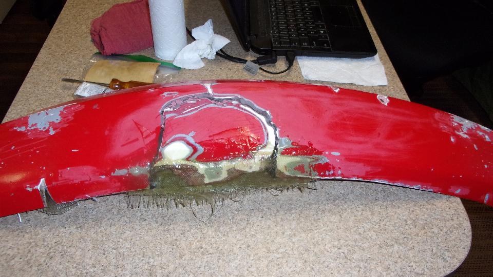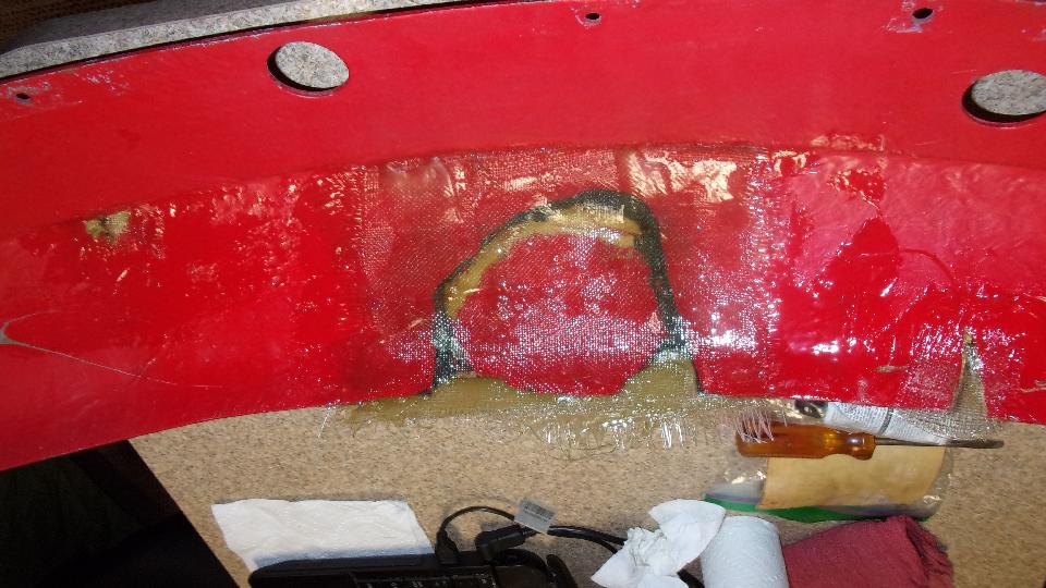 Then around front to apply one layer of cloth saturated with resin, pressing it onto all depressions to eliminate any air pockets. Then continue to fill the depressions with repeated smaller patches of cloth until the pockets were filled flush, followed by one more larger cloth overlay to cover everything. All that followed again by several hours of curing time before the epoxy was set enough to be sanded.