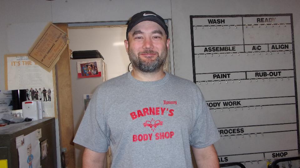 7:30-AM appointment for friend to give me a ride to the body shop to drop off the valance panel and pick up my car. Say hello to Jimmy, auto painting artist and owner of Barney's Body Shop in Columbus, Ohio.