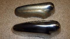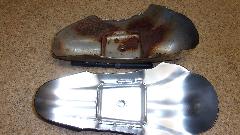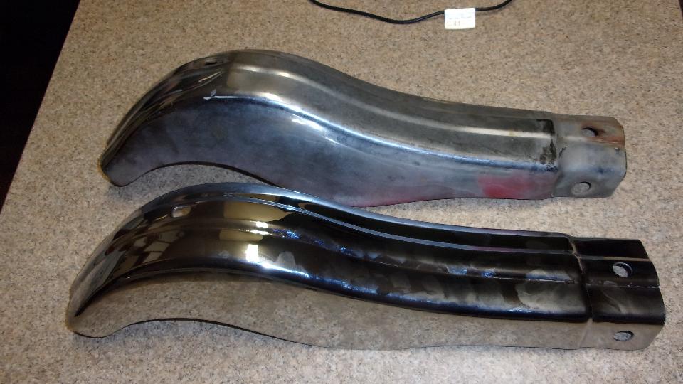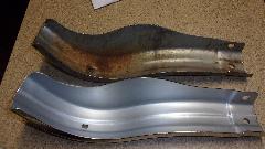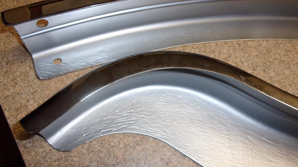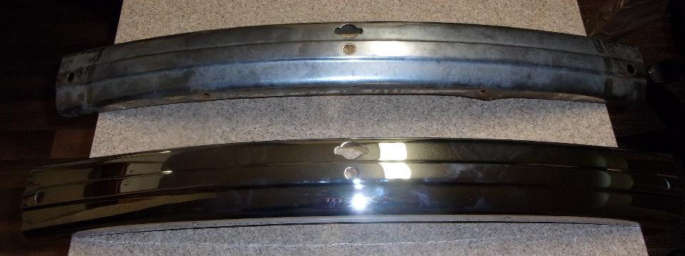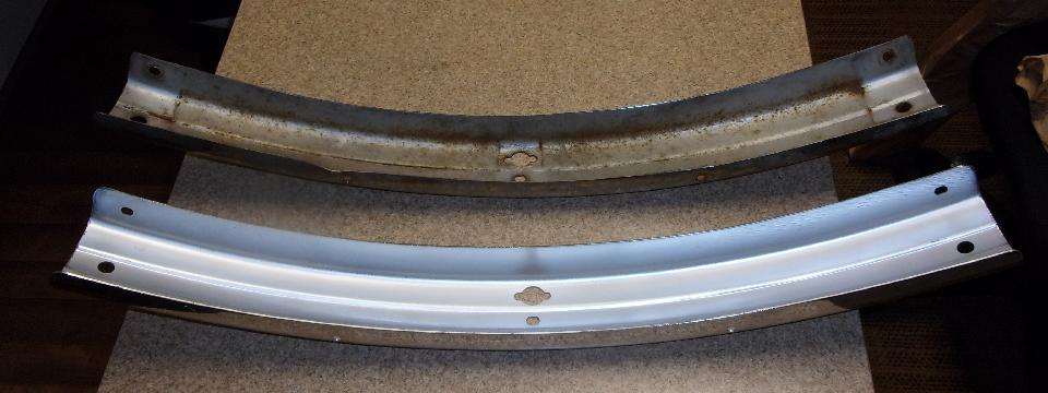 But I did inspect the new chrome parts and got some pictures for report on parts quality. The new facebar has some serious bite marks on underside of the top flanges, all three pieces. I suspect this is intentional tooling marks, like anti-skid on the tooling to hold the parts securely during forming. Inside, underneath, out of site, this should be acceptable even for a show car, but the rest of it is definitely "consumer quality", meaning affordable and not show car quality. It also strikes me as being thinner than OEM parts from back in the 60's, but would need to measure some early parts to verify that. My older facebar is 0.060" thick, and the new one is 0.063" thick, so both 16-gauge (wishful thinking that the difference might be a little extra plating thickness (but probably not).